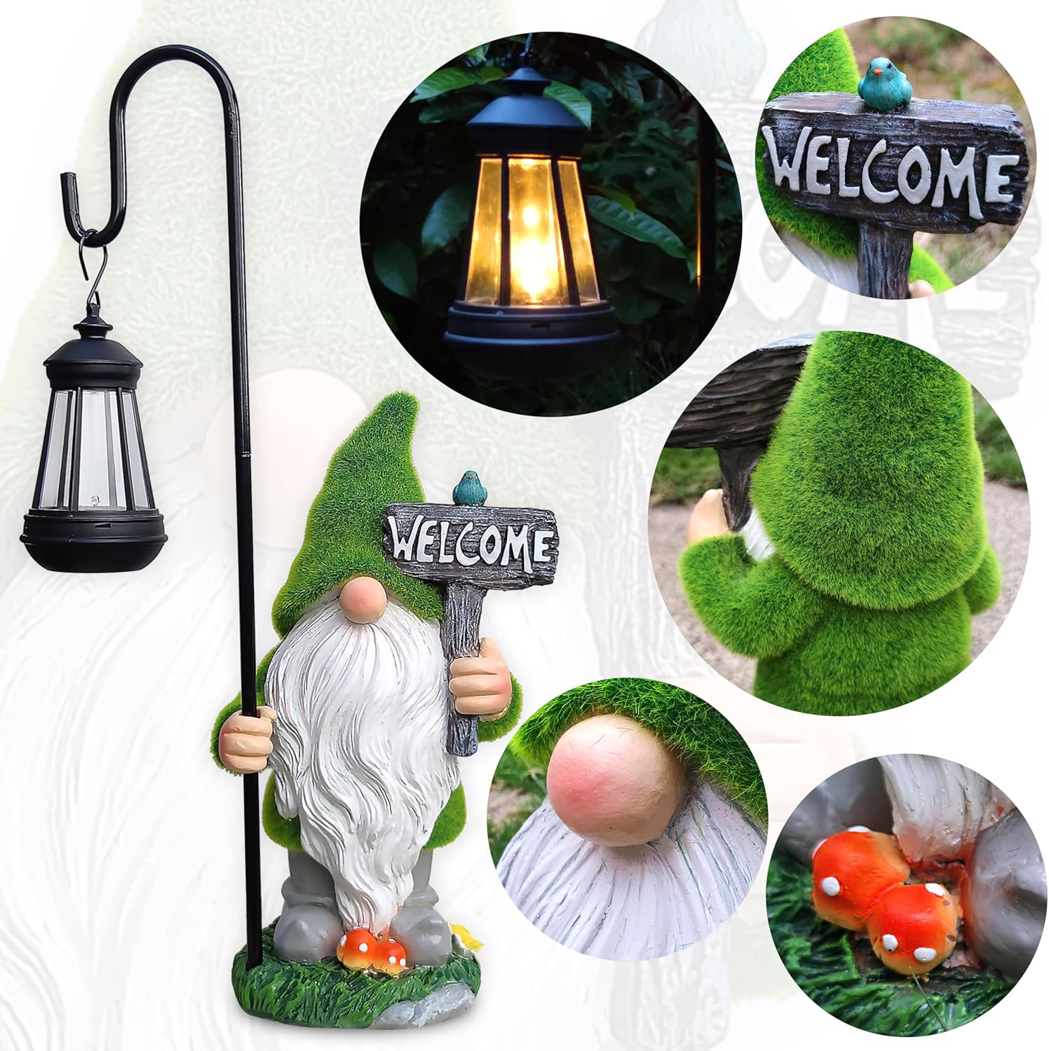 - 【Unique design】This charismatic gnomes gracefully holding a solar lantern, adds a touch of magic to your outdoor space, casting a warm and welcoming glow.The size of this gnomes figurine is 9.8X6.3X4.1inches,the lantern is 5.5X2.75X2.75inches.The gnomes figurines made of resin material, hand-painted and finished with a UV resistant coating can withstand rain, snow or scorching sun without fading.