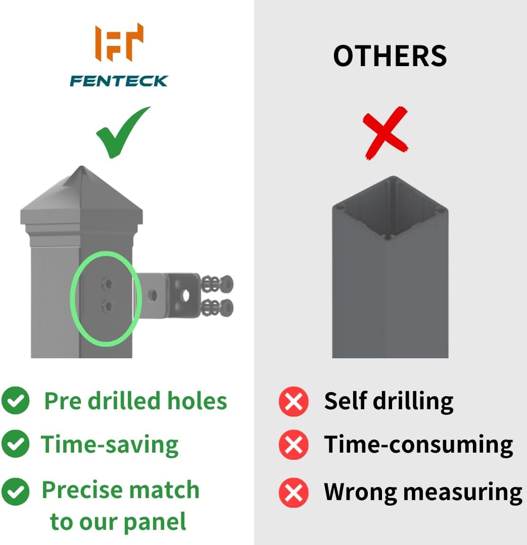 - PRE-DRILLED FOR QUICK AND ACCURATE SETUP: Our fence post features pre-drilled holes to reduce the risk of installation errors. No need to measure and drill yourself—just align and secure for a faster, cleaner, and more reliable DIY setup that looks professionally done.