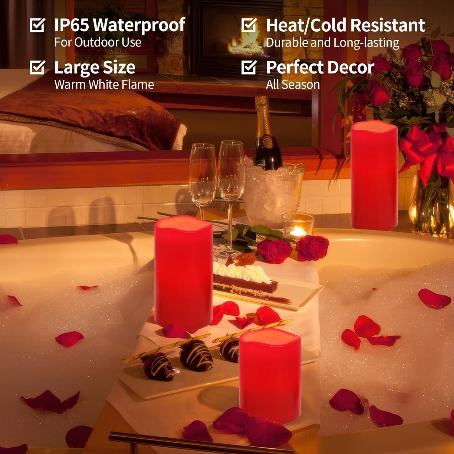 NURADA Large Waterproof Flameless Candles 6" 8" 10" x 4" - Outdoor Indoor LED Pillar Flickering Candle Battery Operated with Timer Remote for Patio Porch Christmas Decor - Red Set of 3