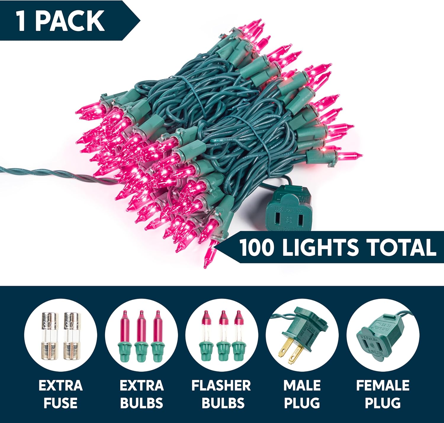 - Premium Quality. Our incandescent pink Christmas string lights are designed with strong durability to accommodate harsh weather conditions. Includes spare bulbs, flashes, and fuses. If one bulb burns out, the others stay lit.