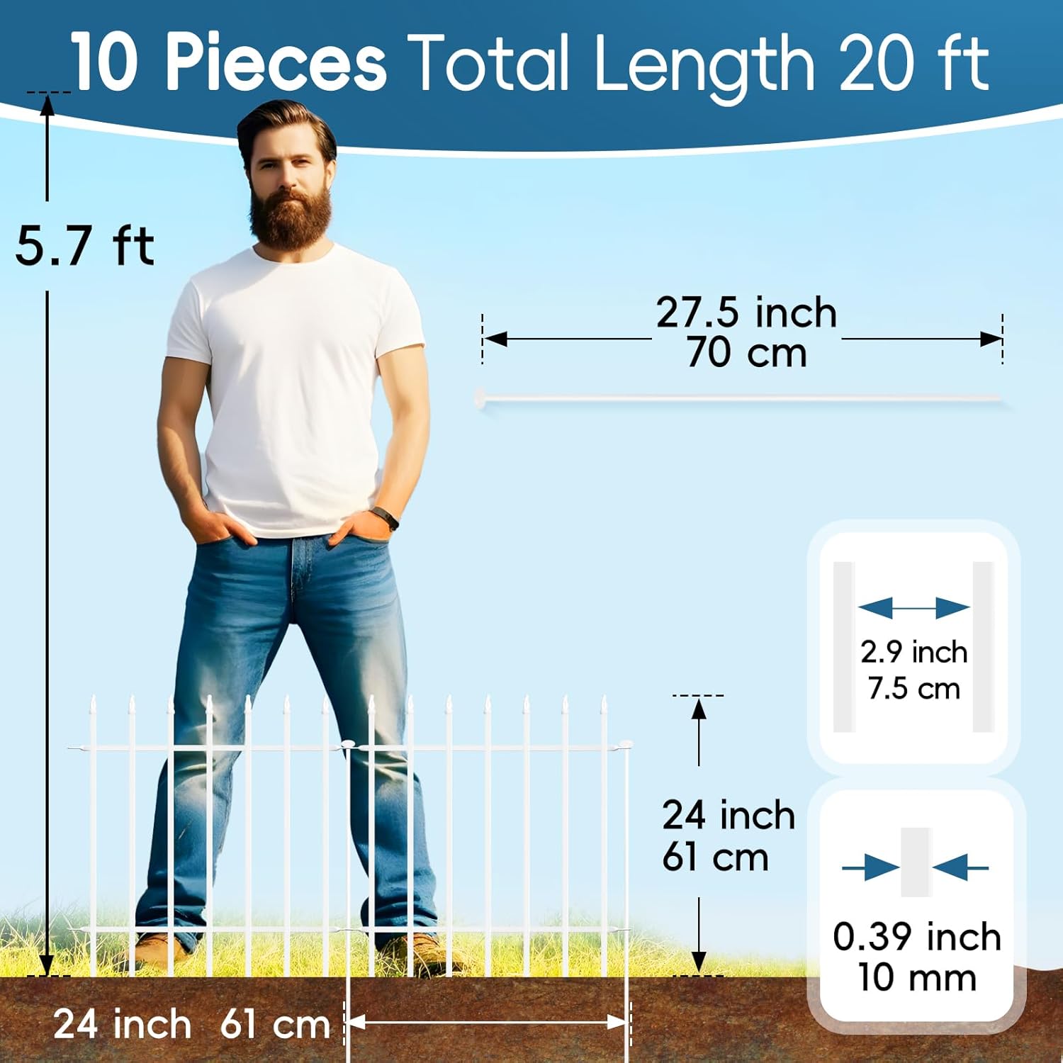 - 【Sturdy and Durable】This metal garden fence is made of 10mm diameter wrought iron welded together and covered with a white rust-resistant coating that won't rust easily. Compared to wood fences and plastic fences, it requires no frequent maintenance, is fearless of insect bites and corrosion, effectively withstands harsh weather, and is durable.