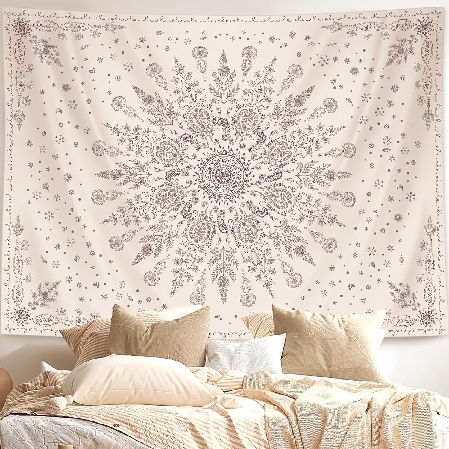 Lunerfex Boho Floral Tapestry Mandala Wall Tapestry, Cute Tapestries for Bedroom Beige Flower Tapestries Wall Hanging for Bedroom Living Room Decor Beige-1 70"x90"