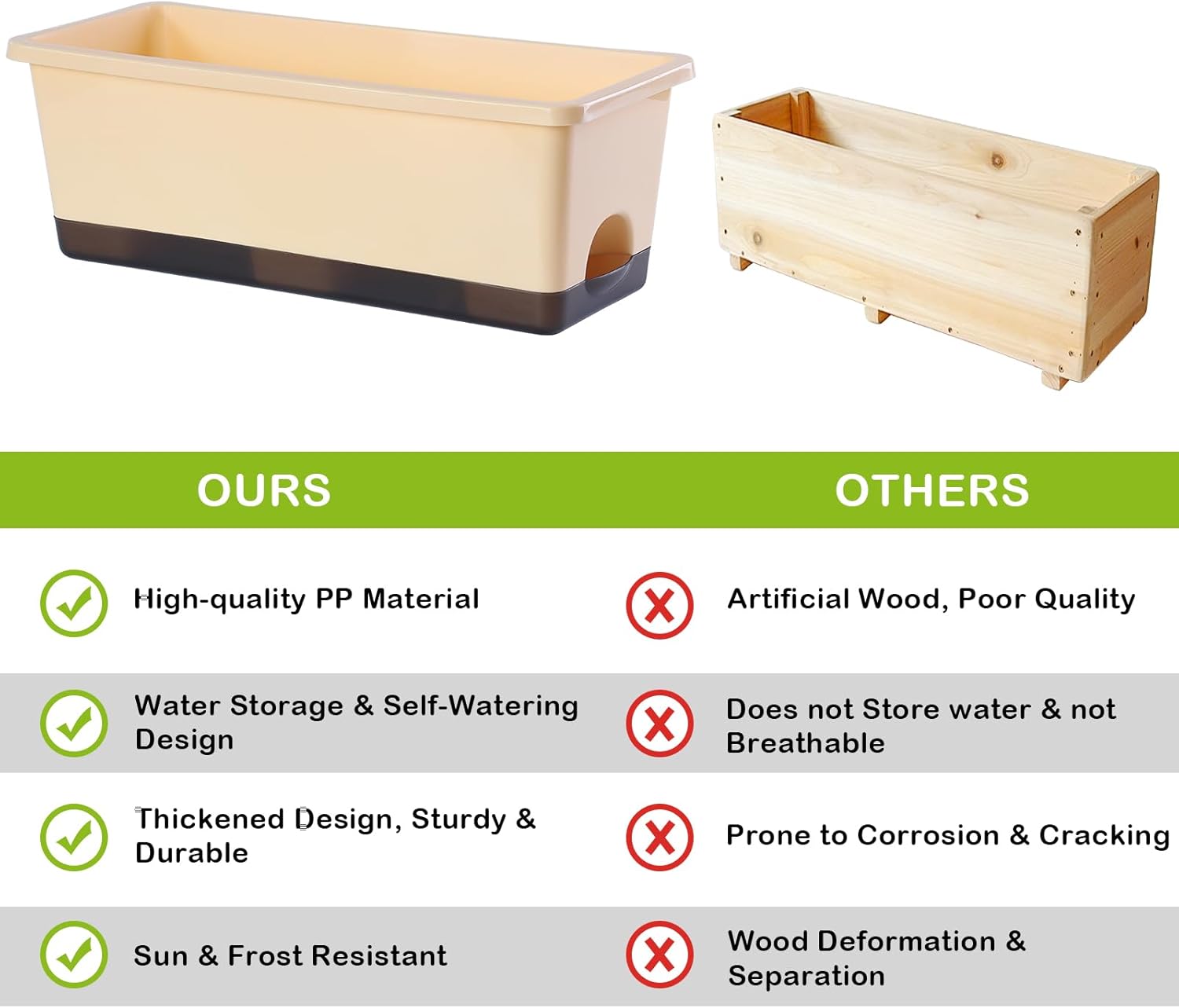 - 【Premium & Durable】The planter pots are made of high quality PP material and has been thickened to bear up to 300KG (660LB). This window box planter is sturdy, wear-resistant and durable. It can be exposed to light, wind, and sunlight for long periods of time, with a lifespan of decades. It is an excellent planter box for both indoor and outdoor.
