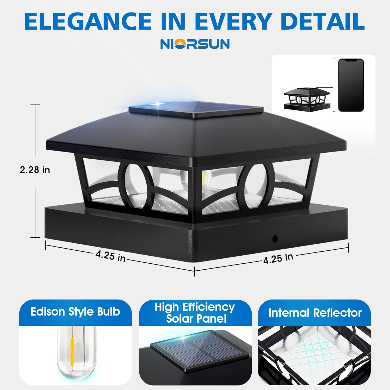 - Edison Bulbs with Warm Light: NIORSUN solar post cap lights outdoor effortlessly combine the classic appeal of Edison-style LED bulbs with the energy-efficient benefits of solar power. These fence post solar lights bring a touch of vintage charm to your outdoor space, casting a warm, golden glow. The soft, ambient light creates a cozy and inviting atmosphere, ideal for relaxing or entertaining guests in your garden or patio