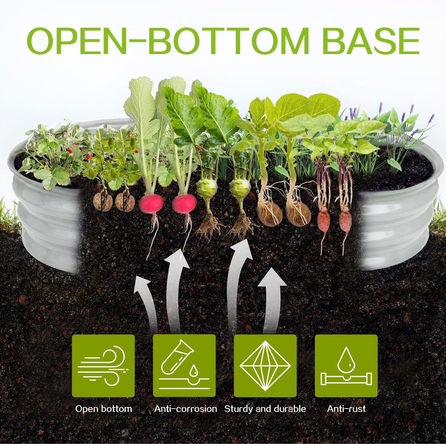 - OPEN BOTTOM DESIGN: Gardmax galvanized planter raised beds are designed with an open bottom, which is good for drainage to protect plants, plant roots won't be sick from excessive water. It also keep weeds away from soil and keep out small pets like chicken, puppies, rabbits to protect your plants.