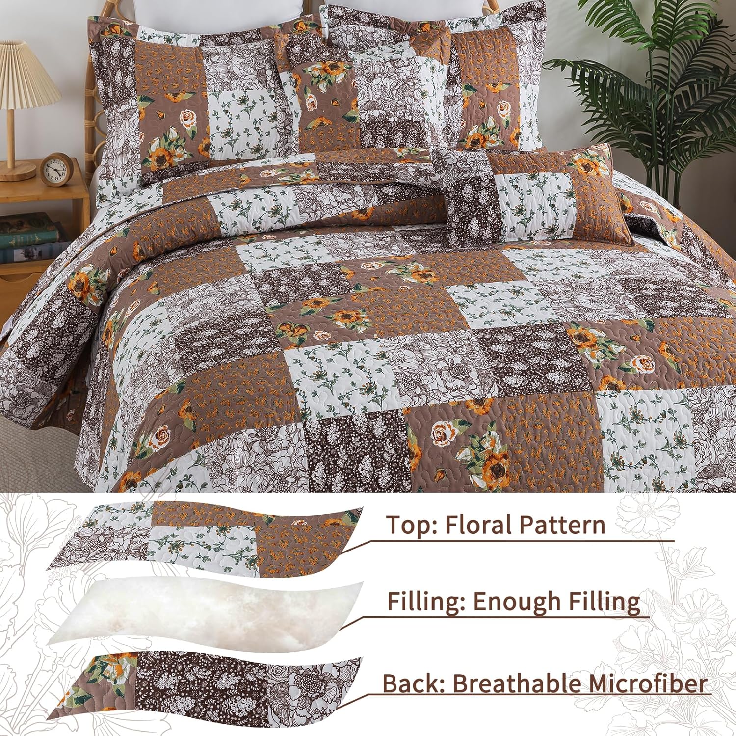 - 【Easy to Care】 Brown king size bedding sets are machine-washable. No color fading and no unraveling after washing. Oversized king quilt can be washed by a gentle water cycle and tumbled dry at low heat. Do not bleach. When received floral quilt, it is vacuum packed, washing will make it softer and fluffier.
