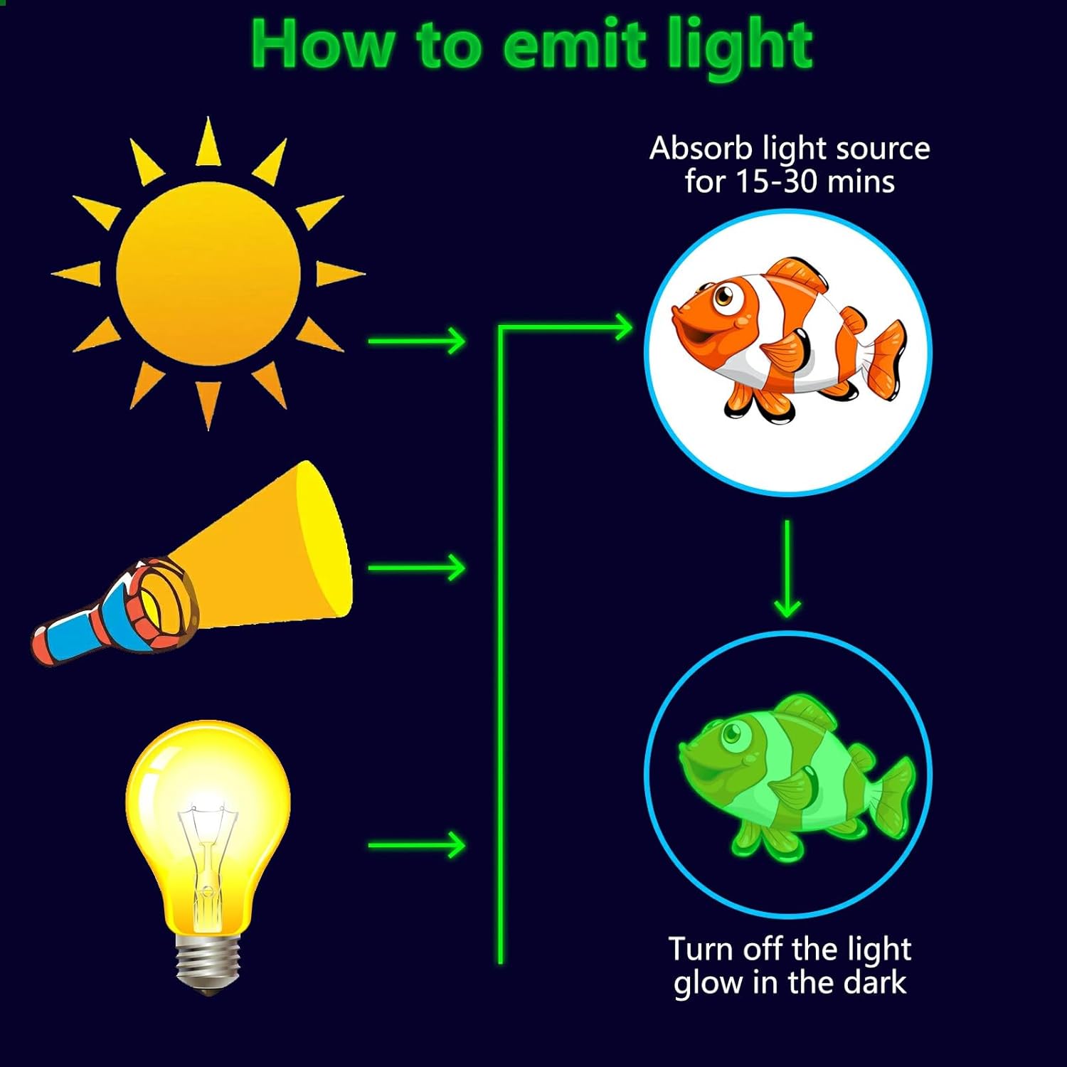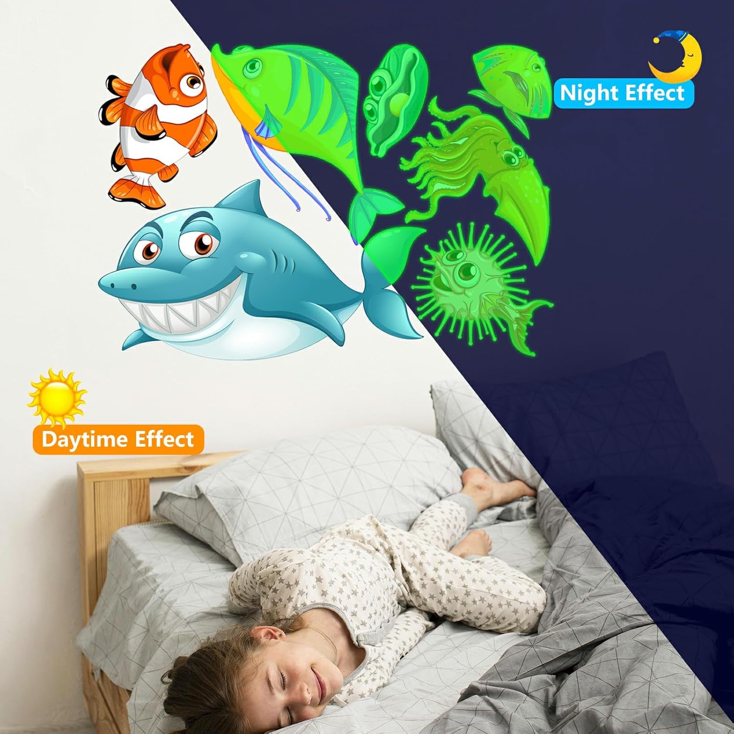 - ⦠Glow Under the Sea Wall Decals: These glow wall decals for ceiling are made of quality luminous material,they will glow brightly when absorb enough light during the day. You just need to put it under lamplight flashlight ,room light or sunshine for 15 minutes, it will keep glowing for 8-10 hours with a gentle green fluorescent light. Please ensure the light shines on the decals without obstruction, the longer it takes to absorb light, then to light up for up to longer.
