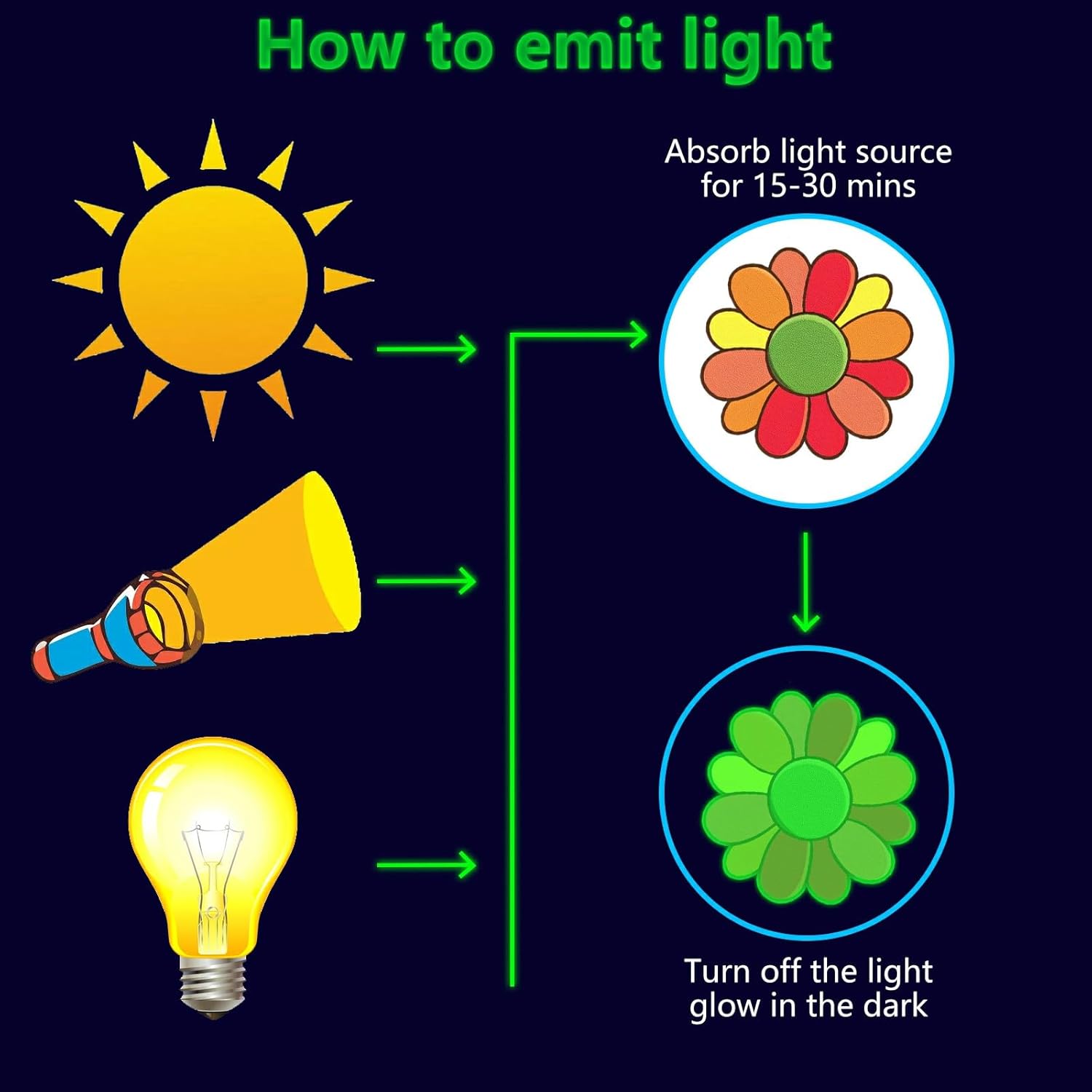 - ⦠Glow Flowers Wall Decals: These glow wall decals for ceiling are made of quality luminous material,they will glow brightly when absorb enough light during the day. You just need to put it under lamplight flashlight ,room light or sunshine for 15 minutes, it will keep glowing for 8-10 hours with a gentle green fluorescent light. Please ensure the light shines on the decals without obstruction, the longer it takes to absorb light, then to light up for up to longer.