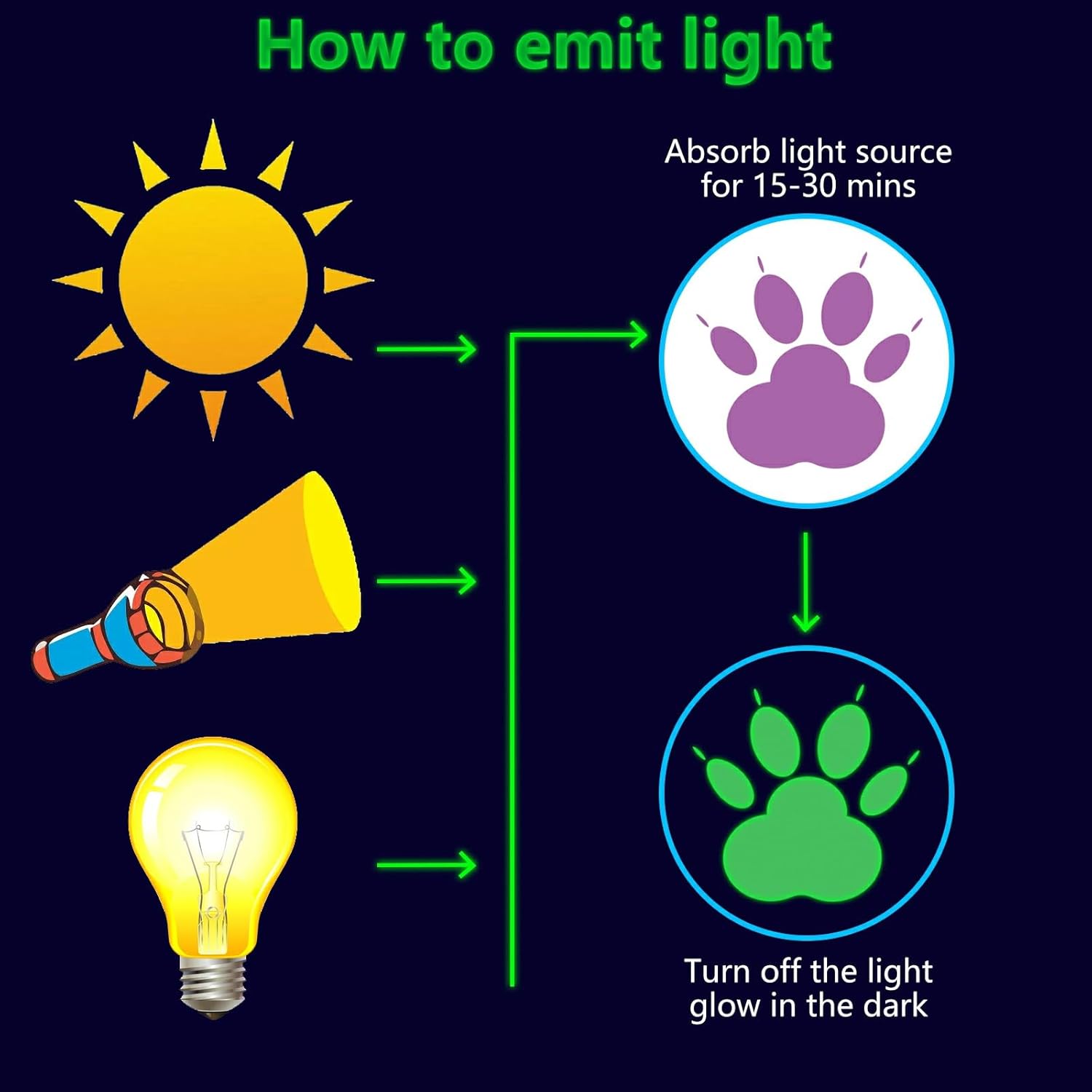 - ⦠Glow Paw Prints Wall Decals: These glow wall decals for ceiling are made of quality luminous material,they will glow brightly when absorb enough light during the day. You just need to put it under lamplight flashlight ,room light or sunshine for 15 minutes, it will keep glowing for 8-10 hours with a gentle green fluorescent light. Please ensure the light shines on the decals without obstruction, the longer it takes to absorb light, then to light up for up to longer.