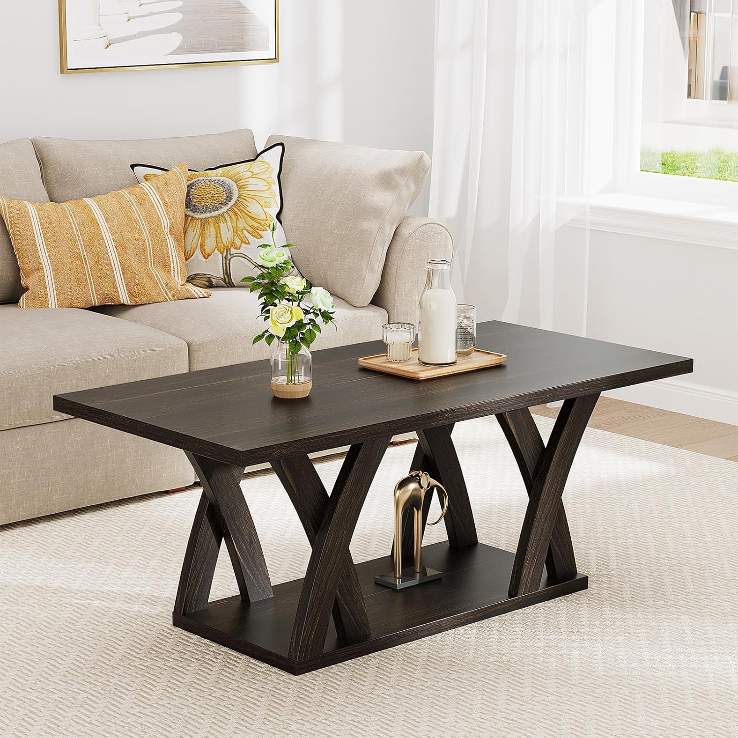 - 【Stylish and Functional Coffee Table】 This coffee table features a rectangular design with a modern touch, making it perfect for wood coffee tables for living room or as a mesa de centro para sala. Its coordinated colors and sleek X-shaped base blend effortlessly into various styles, whether as a Farmhouse Coffee Table with Shelf or a centerpiece in a traditional setting. The brown coffee table design adds a timeless elegance to any space.