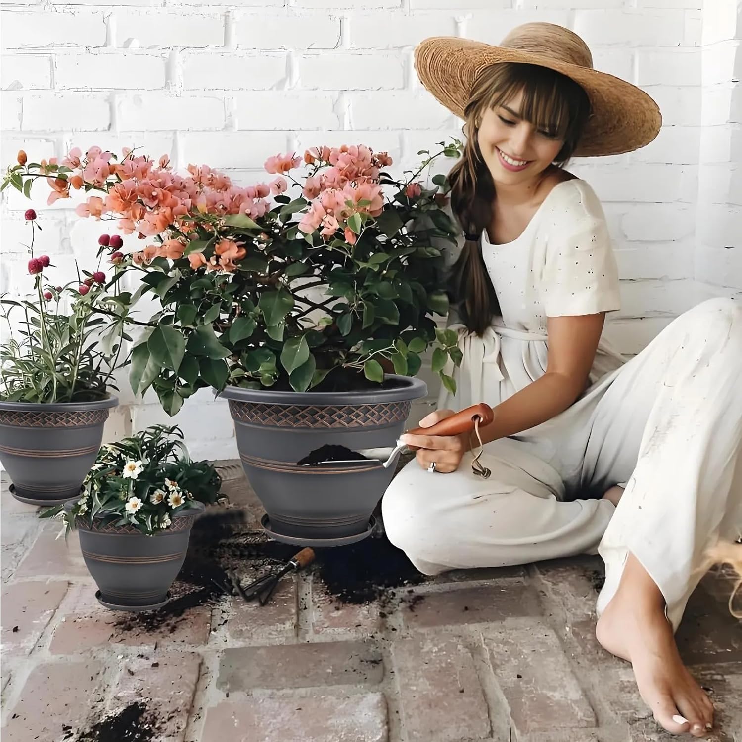 - Drainage Hole and Saucer - There are 8 drainage holes at the bottom of our garden pots, which can control excess water, increase the breath ability and benefit the growth of plants; the lightweight saucer can not only collect excess water,but also keep your floor or desktop clean.