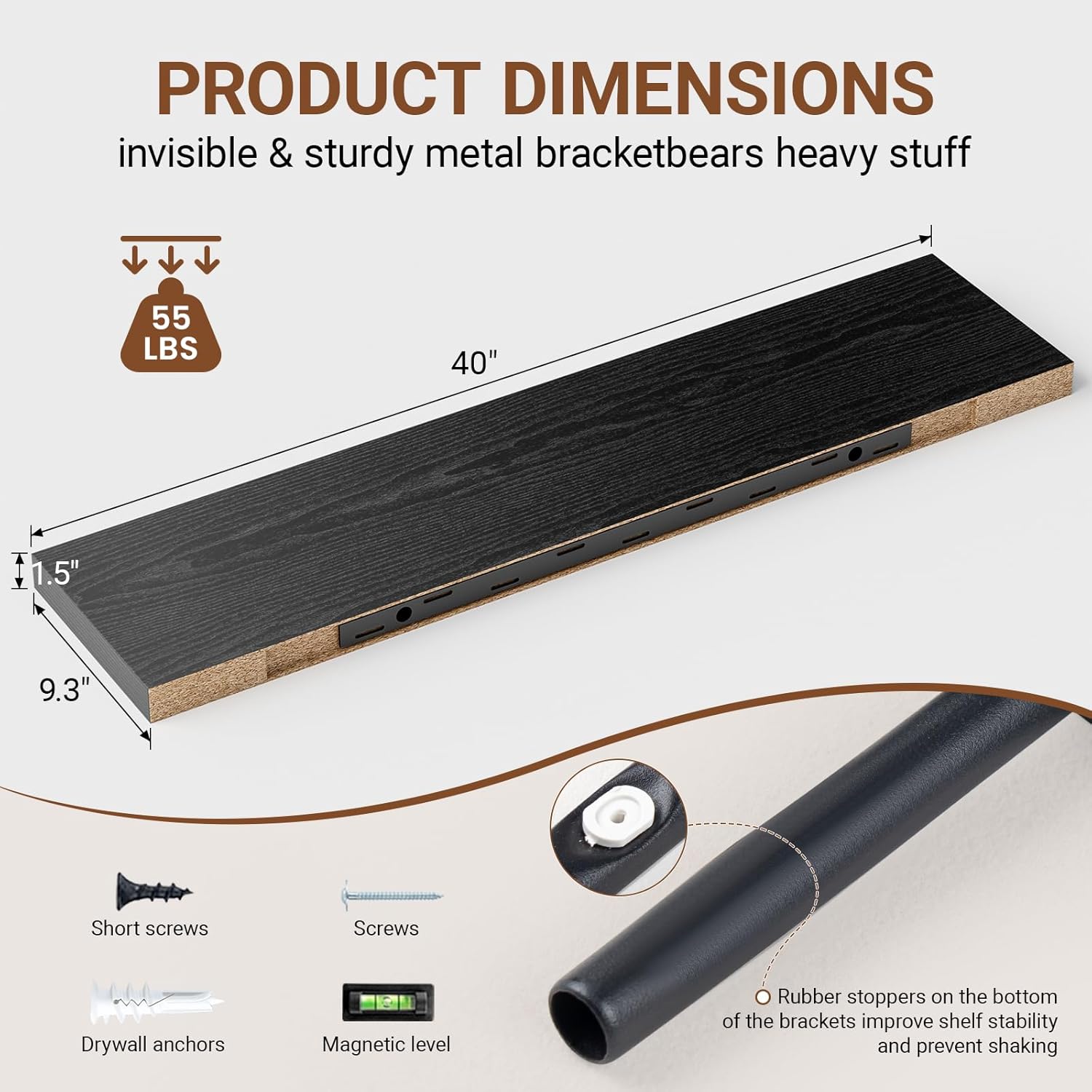 - ăLonger DesignăOur pretty black wall shelves are 40"W x 9.3"D x 1.5"H.Our black floating shelves is longer than traditional designs and can hold more items.The black floating shelf optimize wall space,helping organize essentials without taking up floor space in your home.