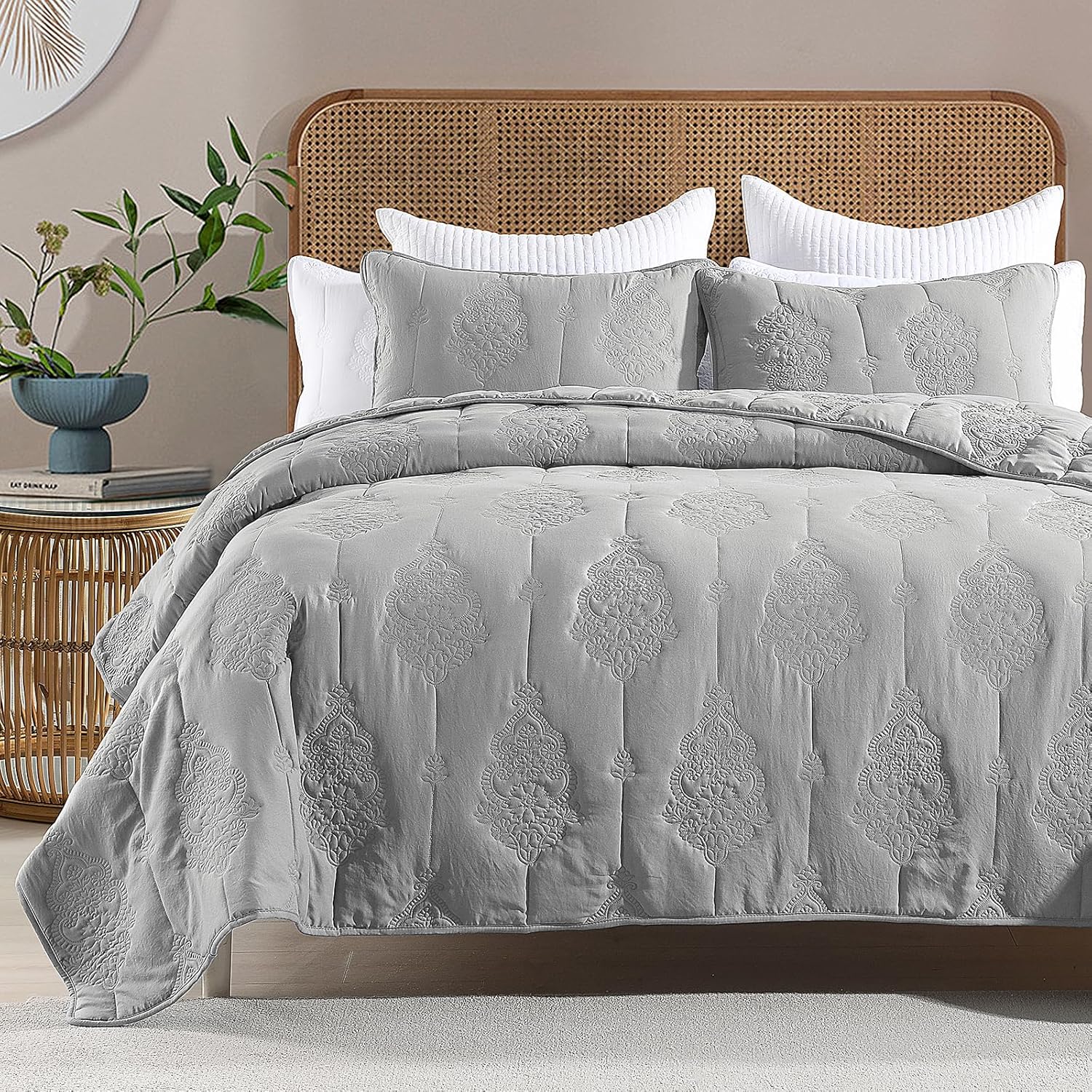 HORIMOTE HOME Grey Quilt King Size Floral Quilt Bedspread Lightweight Soft Pre-Washed Microfiber Bedcover, 3 Pieces Thin Comforter Bed Cover Bedding Set for All Season