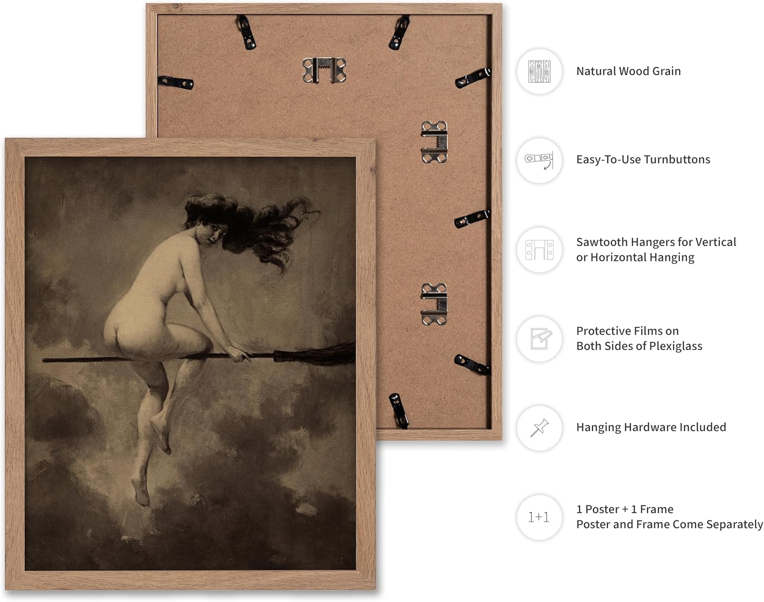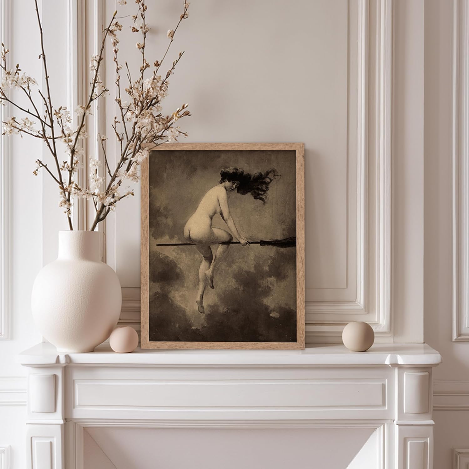 Poster Master Vintage Albert Joseph Penot Poster - Retro Halloween Print - Gift for Artist, Friend - Departure for the Sabbath, Naked Witch on Broom - Wall Decor for Bedroom, 11x14 Beige Framed
