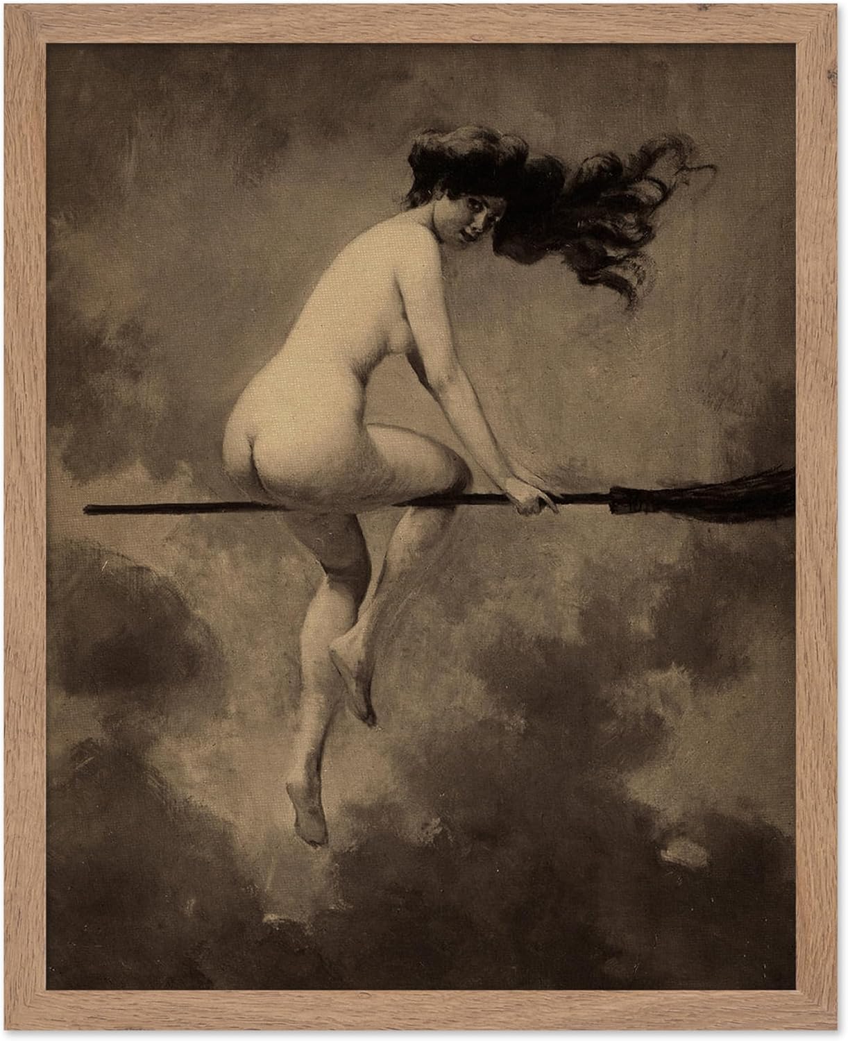 Poster Master Vintage Albert Joseph Penot Poster - Retro Halloween Print - Gift for Artist, Friend - Departure for the Sabbath, Naked Witch on Broom - Wall Decor for Bedroom, 8x10 Beige Framed