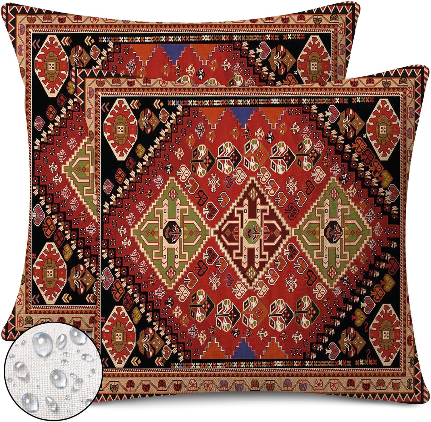 Outdoor Waterproof Pillow Covers 18x18 Inch Set of 2 Tribal Abstract Red and Black Vintage Carpet Pattern Decorative Farmhouse Pillow Covers for Couch Garden Balcony