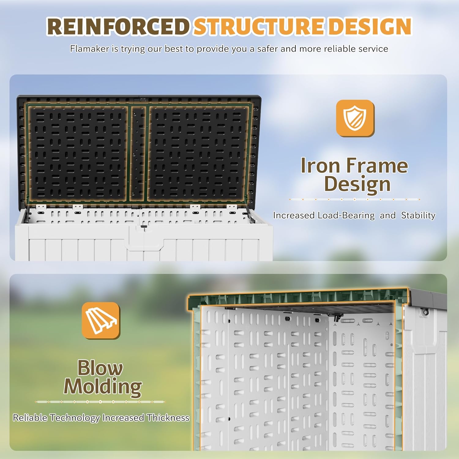 - [As a Seat] Flamakerโs large outdoor storage deck box, not only guarantees the storage capacity, but can be used as a seat, which can be used by up to 2 people