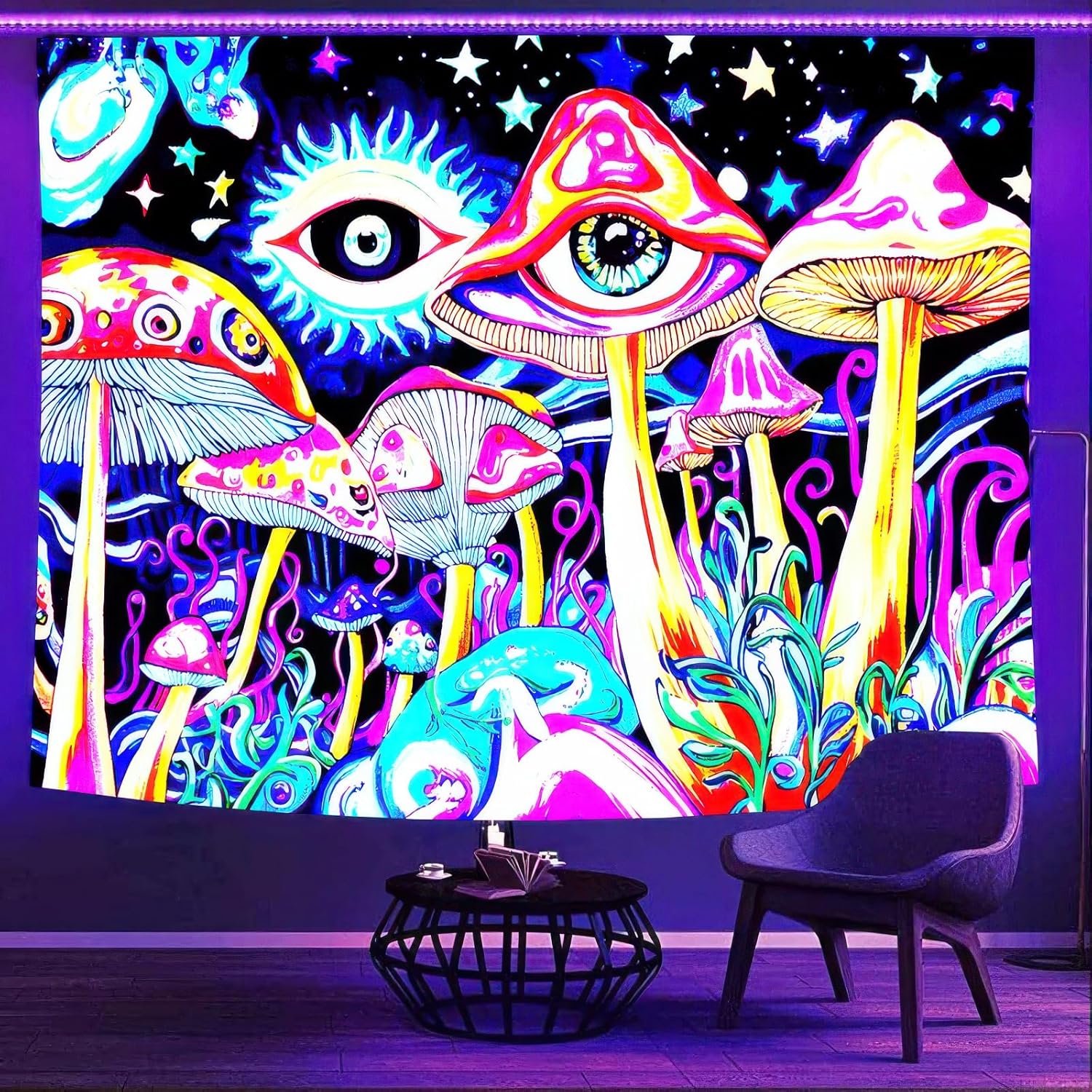 BlissYard Blacklight Tapestry Mushrooms Tapestry for Bedroom Uv Reactive Tapestry 78x59 Inches Cosmic Mushrooms Wall Hanging, Fluorescent Art Decoration with Eyes, Stars, and Psychedelic Design