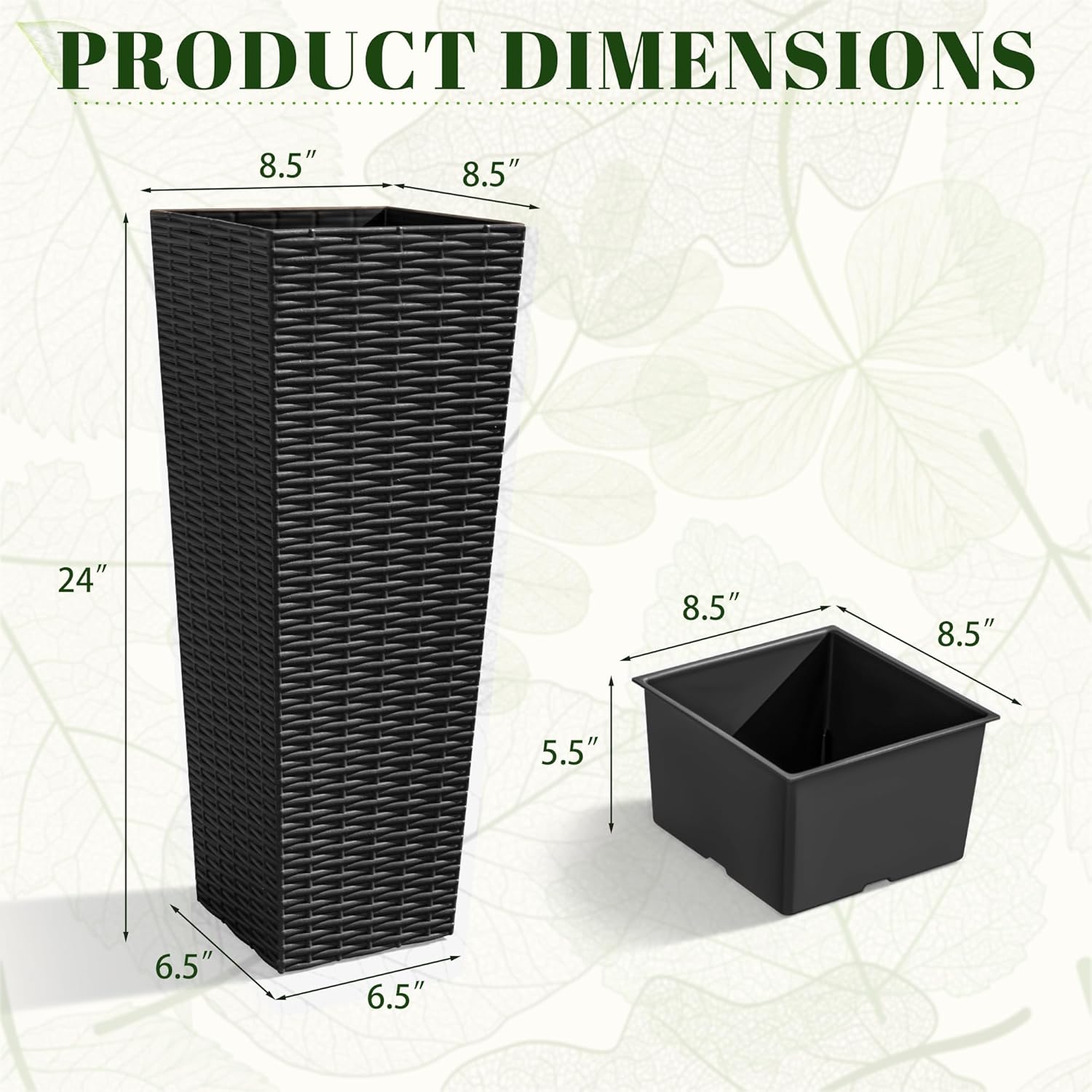 JUMMICO Set of 2 Resin Rattan Tall Planters for Outdoor Plants, Large Tapered Planters with Drainage Holes&Inner Trays, Flower Pots for Garden, Patio, Porch, Backyard (Black, 24'')