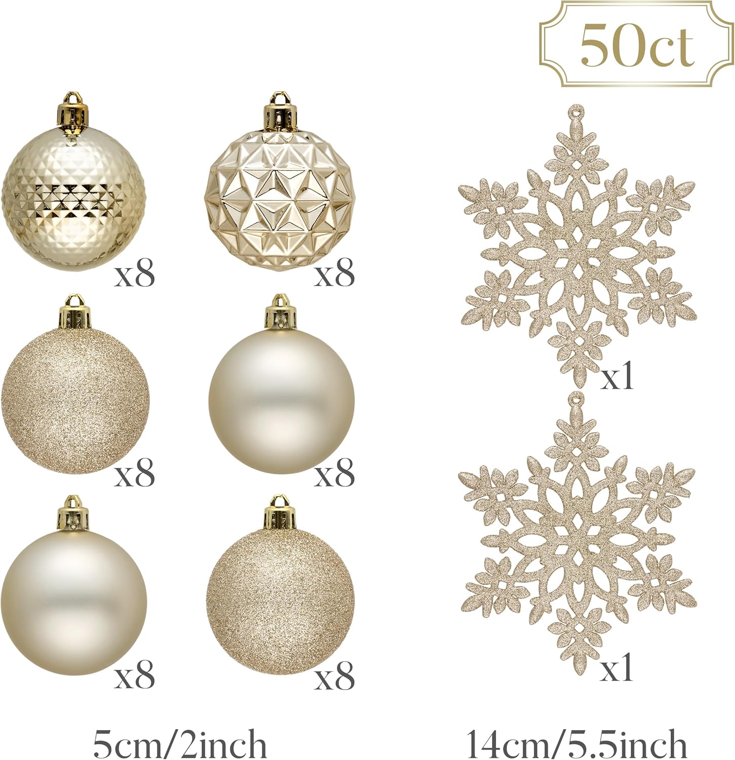 • 【Package and Size】This ornament ball set include 50pcs Christmas ornaments measuring 2 inches in diameter, featuring seamless connections for a polished look