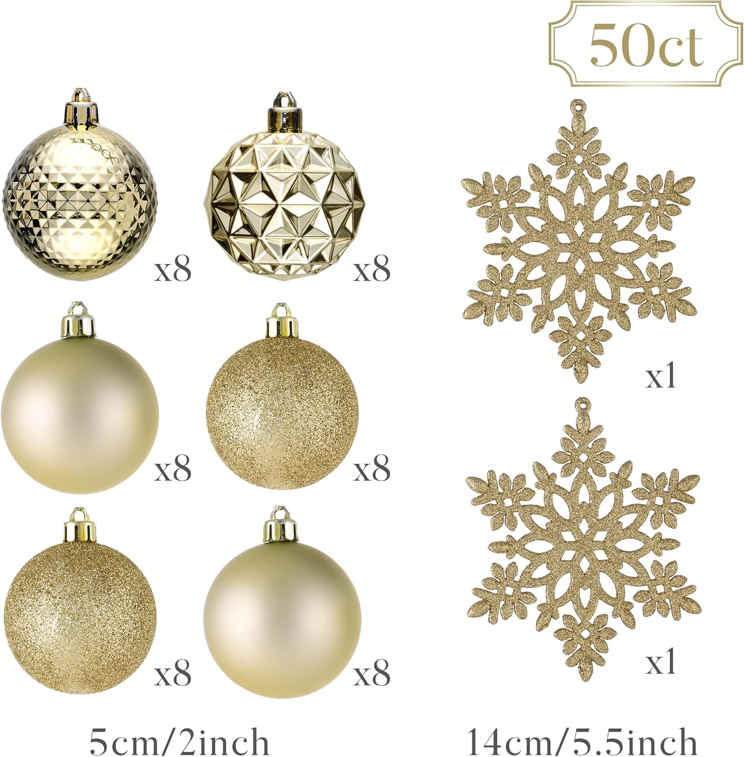 • 【Package and Size】This ornament ball set include 50pcs Christmas ornaments measuring 2 inches in diameter, featuring seamless connections for a polished look