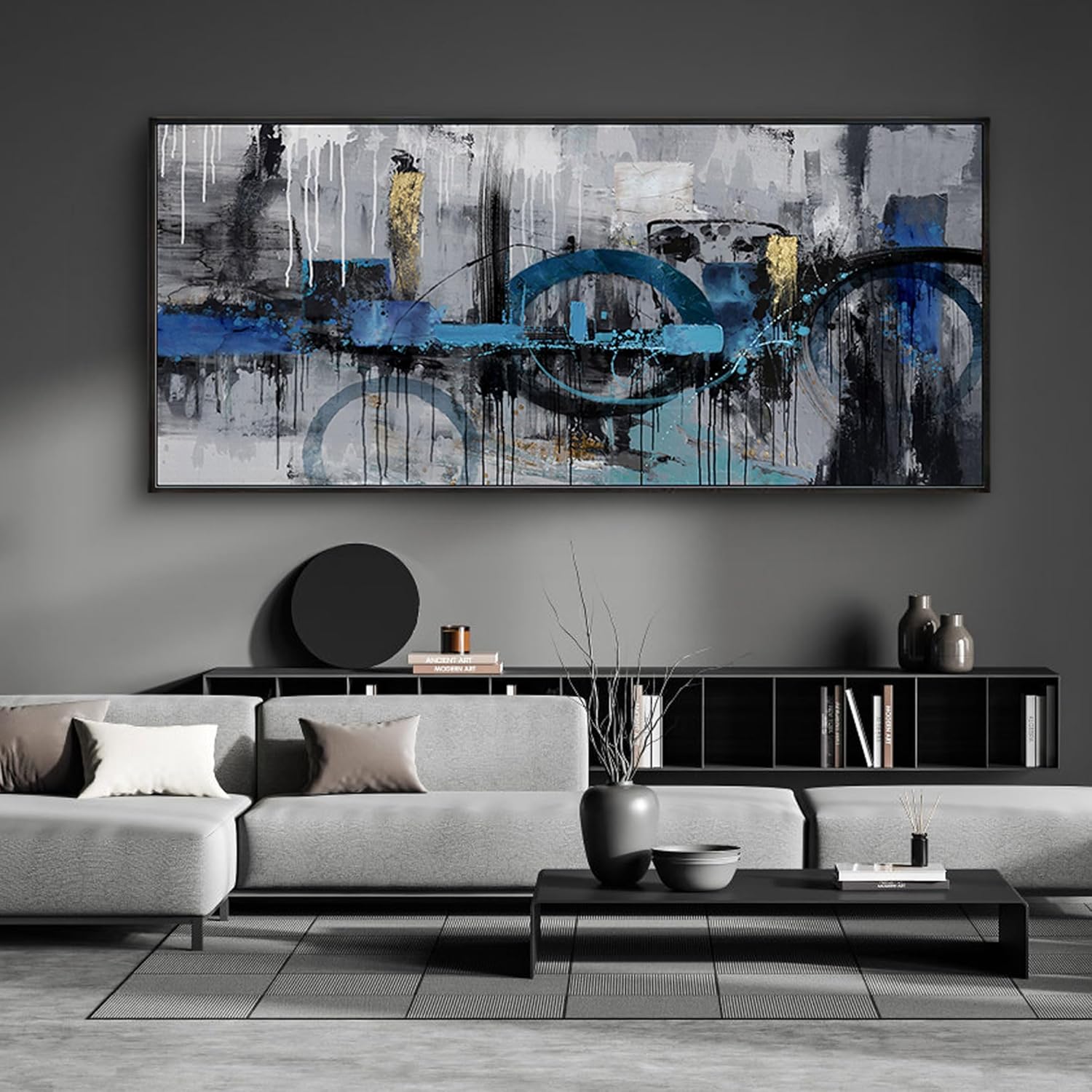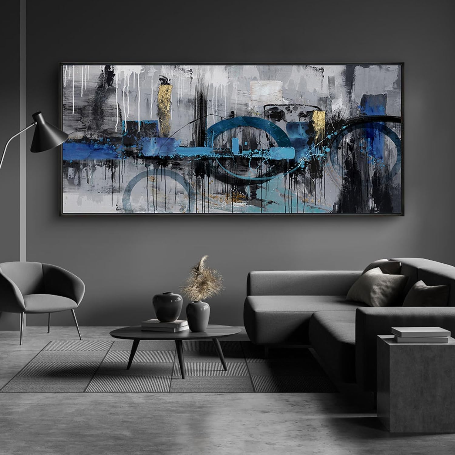 KLAKLA Large Abstract Wall Art Canvas - Blue and Gray Lnk Style Gold City Scenes Wall Decor Living Room Bedroom Decoration Black Frame Picture Artwork for Wall Modern Landscape Wall Decor
