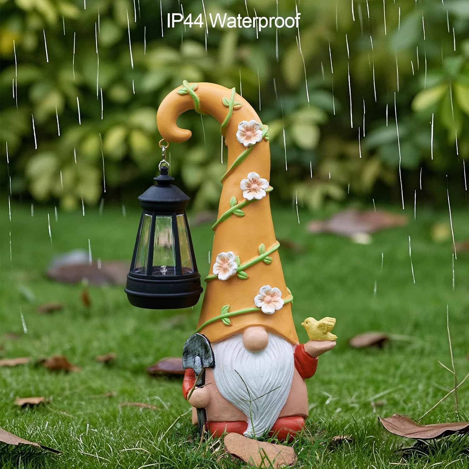 - [Unique Gnome Garden Decor for Outdoor Charm] This 11.73” tall gnome statue adds whimsical garden decor to your outdoor space. Featuring a bearded gnome in an orange outfit, holding a bird and shovel with a lantern hanging from a flower-wrapped hat—perfect for garden gnomes outdoor lovers