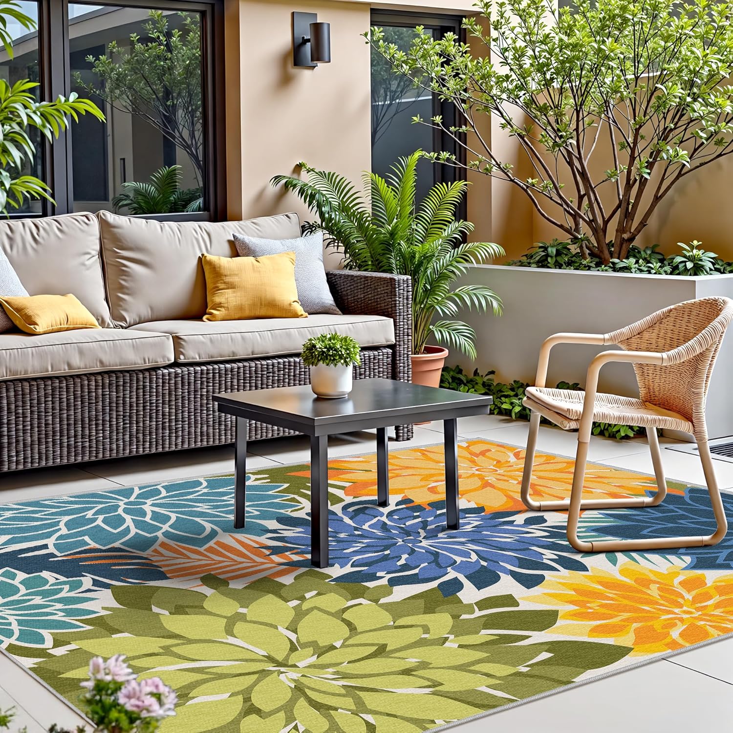 Indoor Outdoor Area Rug Washable Multicolored Patio Rug Tropical Botanical Modern Floral Indoor Outdoor Carpet Non Slip Yellow Green Rug Non Shedding for Patio, Deck, Backyard, Porch (6x9)