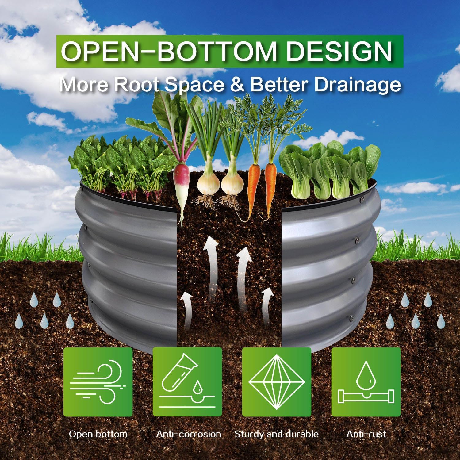 - OPEN BOTTOM DESIGN: GARDMAX galvanized planter raised beds are designed with an open bottom, which is good for drainage to protect plants, plant roots won't be sick from excessive water. It also keep weeds away from soil and keep out chicken small pets like puppies, rabbits to protect your plants