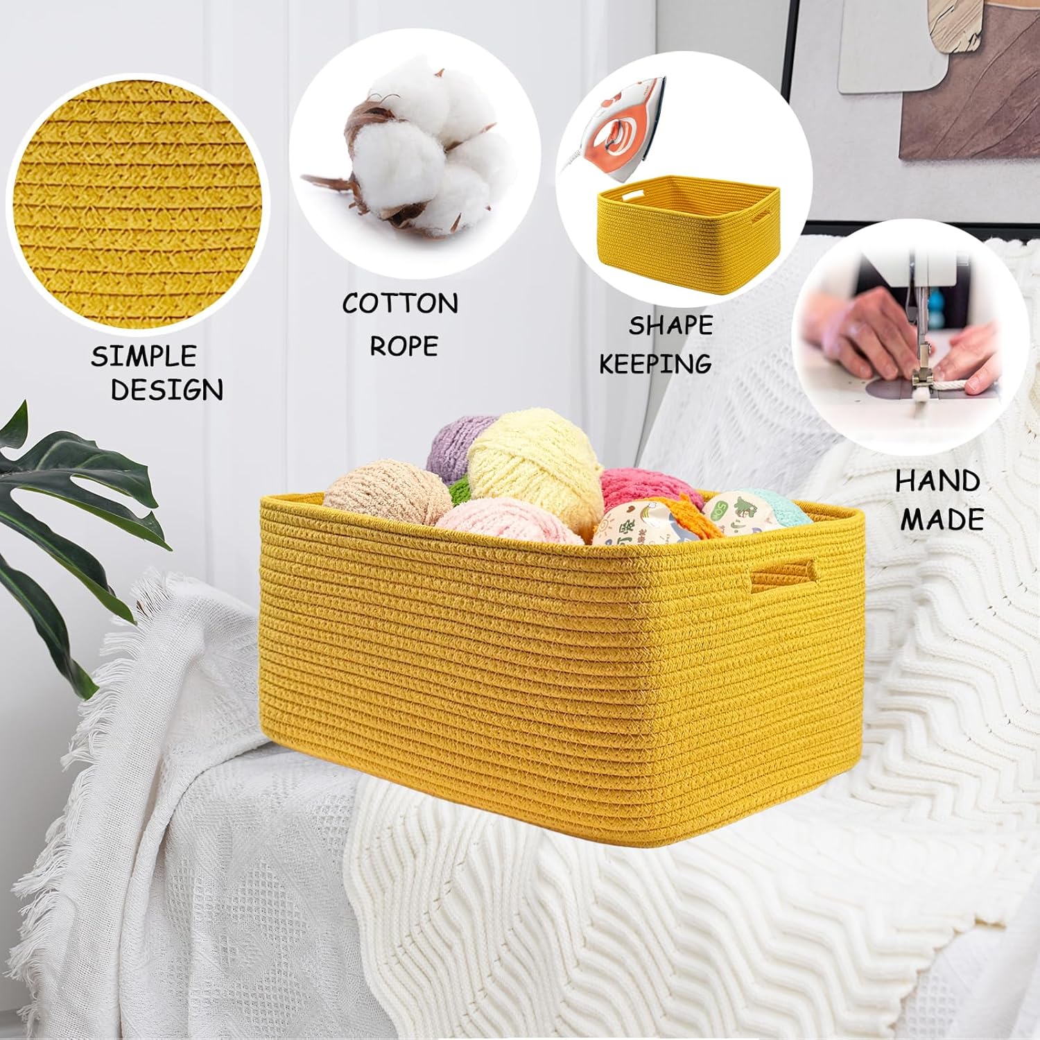 COMFY-HOMI Cotton Rope Woven Basket with Handles for Shelves,Toys,Book, Cloth Storage Baskets for Organizing-17" x 13" x 7.5" Toy Decorative Organizer for Living Room, Bathroom (Yellow)