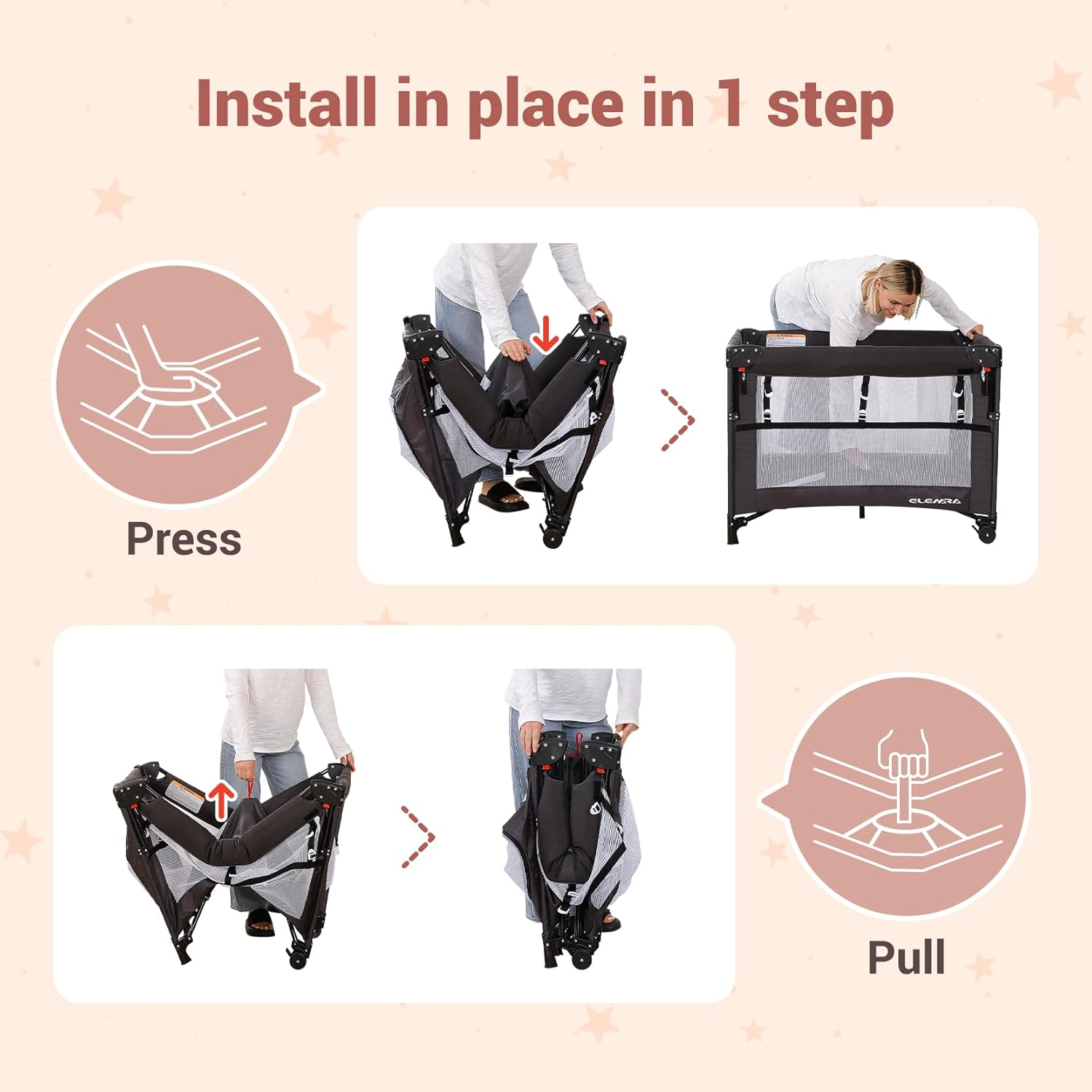 - 👶【Portable Travel Design】This Magic Fold Baby Pack n Play takes only 1 second to complete the opening and closing action,no need to install the armrest,the hand press down the middle support bar immediately open, comes with a travel pouch that takes up very little space after storage, making it very portable and perfect for family trips or visiting friends