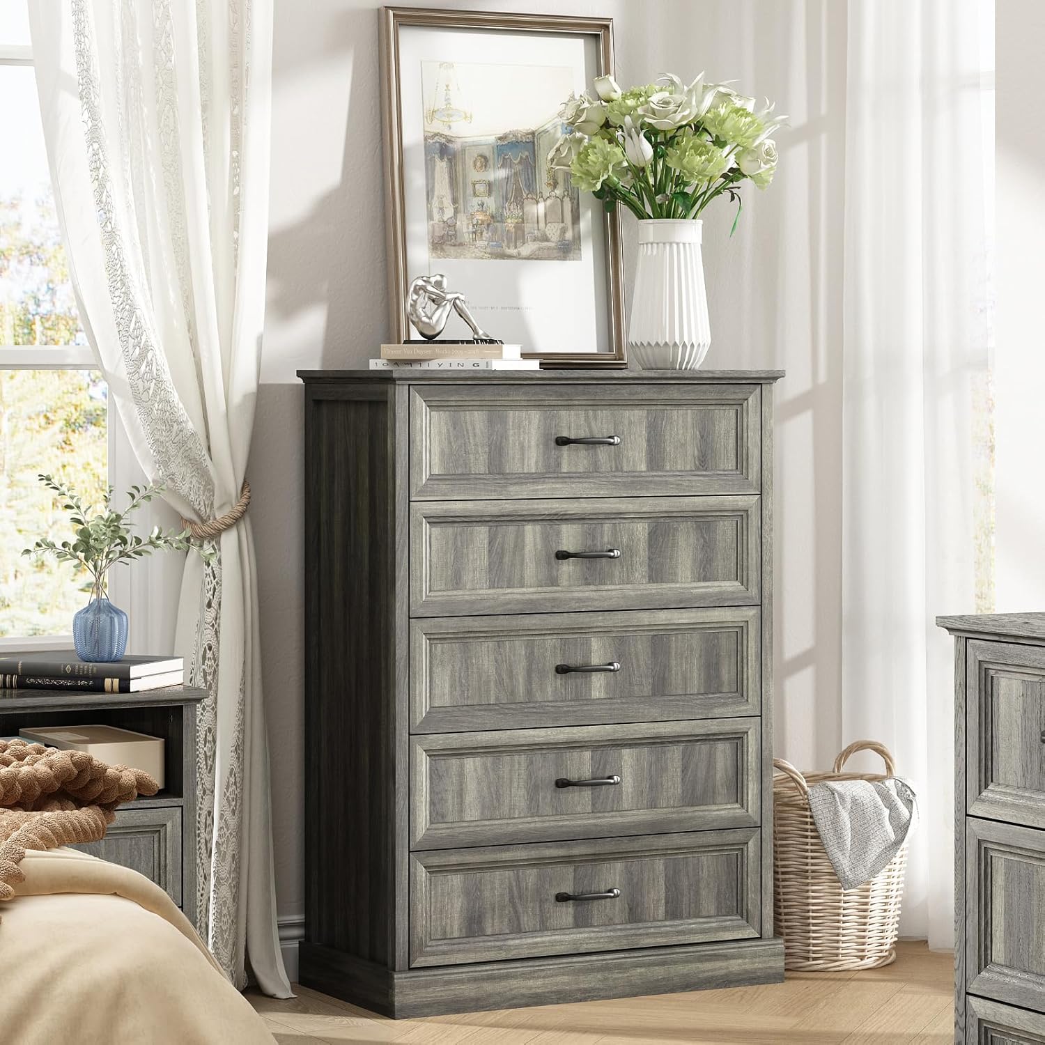 - Versatile, Stylish Dresser: Measuring 31.5"W × 15.7"D × 44.1"H, this versatile tall farmhouse dresser for bedoom offers an array of possibilities for your home organization. It features 5 smooth-glide drawers, each measuring 27.9"W × 11.3"D × 5.7"H, offering efficient storage solutions. Keep your space clean and organized by conveniently stowing clothing, socks, bedding, cosmetics, jewelry, and more. The natural-textured tabletop gives you more space to display your cherished photos, artworks, and decorations, turning your room into a captivating gallery.