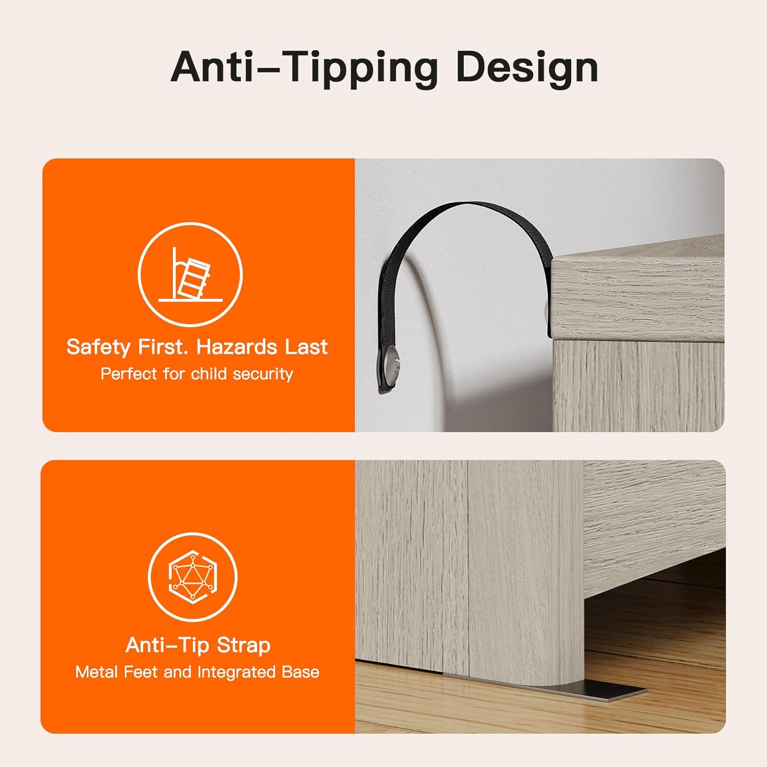 - ăFour-Safety Protection Designăpipishell modern bedroom dresser features rounded edges to minimize the risk of injury for children. It includes an anti-toppling device that can be securely fastened to the wall. The reinforced base and optional metal gaskets provide robust support for this drawer unit, making it an excellent choice for families with children or pets.