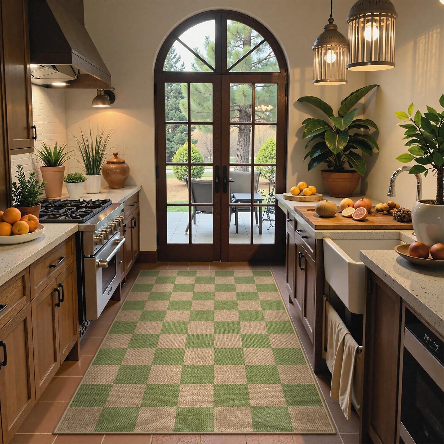 - Modern Checkered Rug: Showcasing checkerboard in green and natural colors, purposely distressed and faded geometric checkerboard design, it makes a great option for anchoring modern farmhouse aesthetics