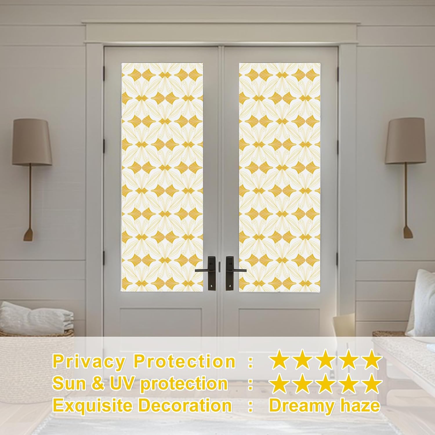Window Privacy Film Stained Glass Decorative Static Clings Frosted Window Tint for Home Room Decor Bathroom Door Car Stickers with Glittering Effect, Removable(Golden Geometry)