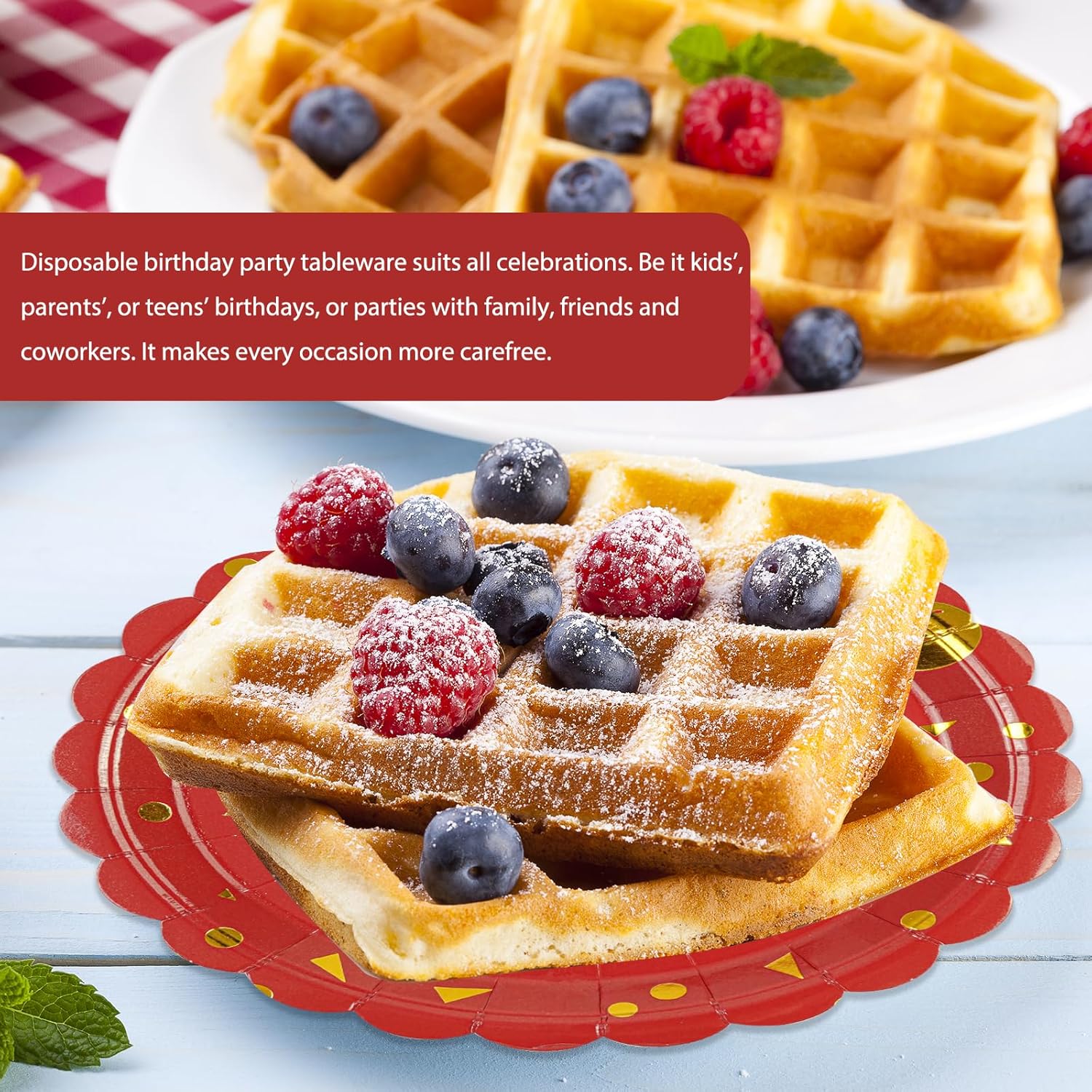 - 【FESTIVE BIRTHDAY PARTY SUPPLIES】: Red birthday party plates set comes with 50pcs red paper plates, serve up to 50 guests, specifically for dessert plates size: 18cm/7inch, small but definitely sturdy enough to serve dessert, cake, appetizers and other party foods, gold foil paper plates are exquisite and generous, it's a must-have finishing touch to your birthday dinner!