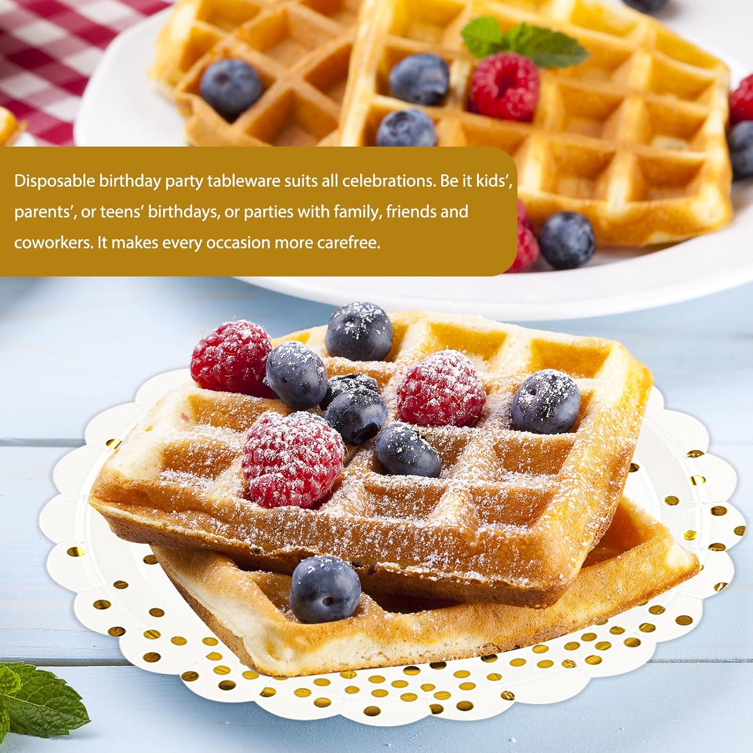 - 【SUPERIOR QUALITY】: Made from thick and food grade 350gsm heavy duty paper, environmentally friendly, odorless, heat resistant, these disposable white plates are strong enough to hold a variety of snacks, salads, and desserts without sagging or tearing. The surface is made of a waterproof membrane, so that your white and gold cake plates can be used with more peace of mind.