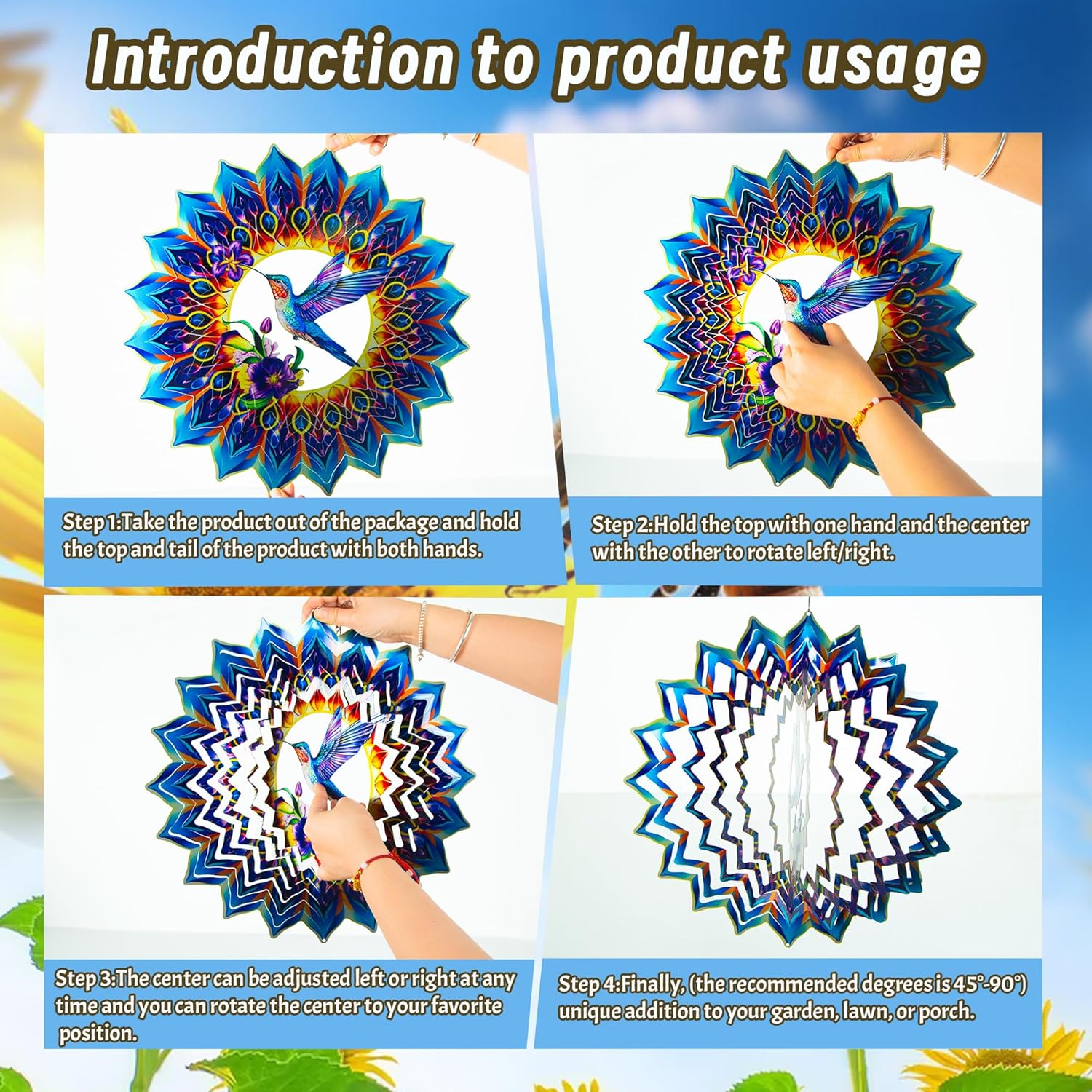 - 【Product Introduction】: This upgraded 15.7 x 15.7 inch 3D wind spinner offers a larger, more eye-catching design than our classic 12-inch model. Made of high-quality stainless steel with precision cutting and advanced PUV printing, it features a vivid 3D hummingbird shape that adds dynamic charm to any outdoor space.