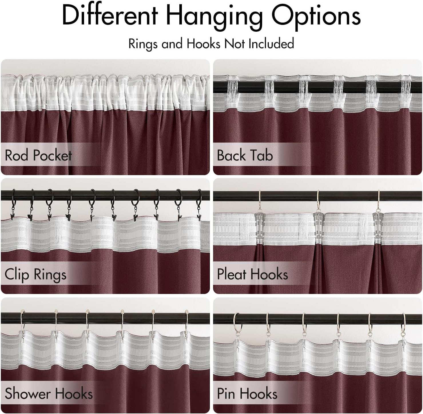 - HANGING OPTIONS: Each curtain panel has 3-in-1 top style design: rod pocket, back tab and pinch pleat. Back loop (2.3 inch) and rod pocket (3.1 inch) fit most standard rod. Curtains also can be hung with clip rings or curtain hooks. 3 ways to meet your various needs.