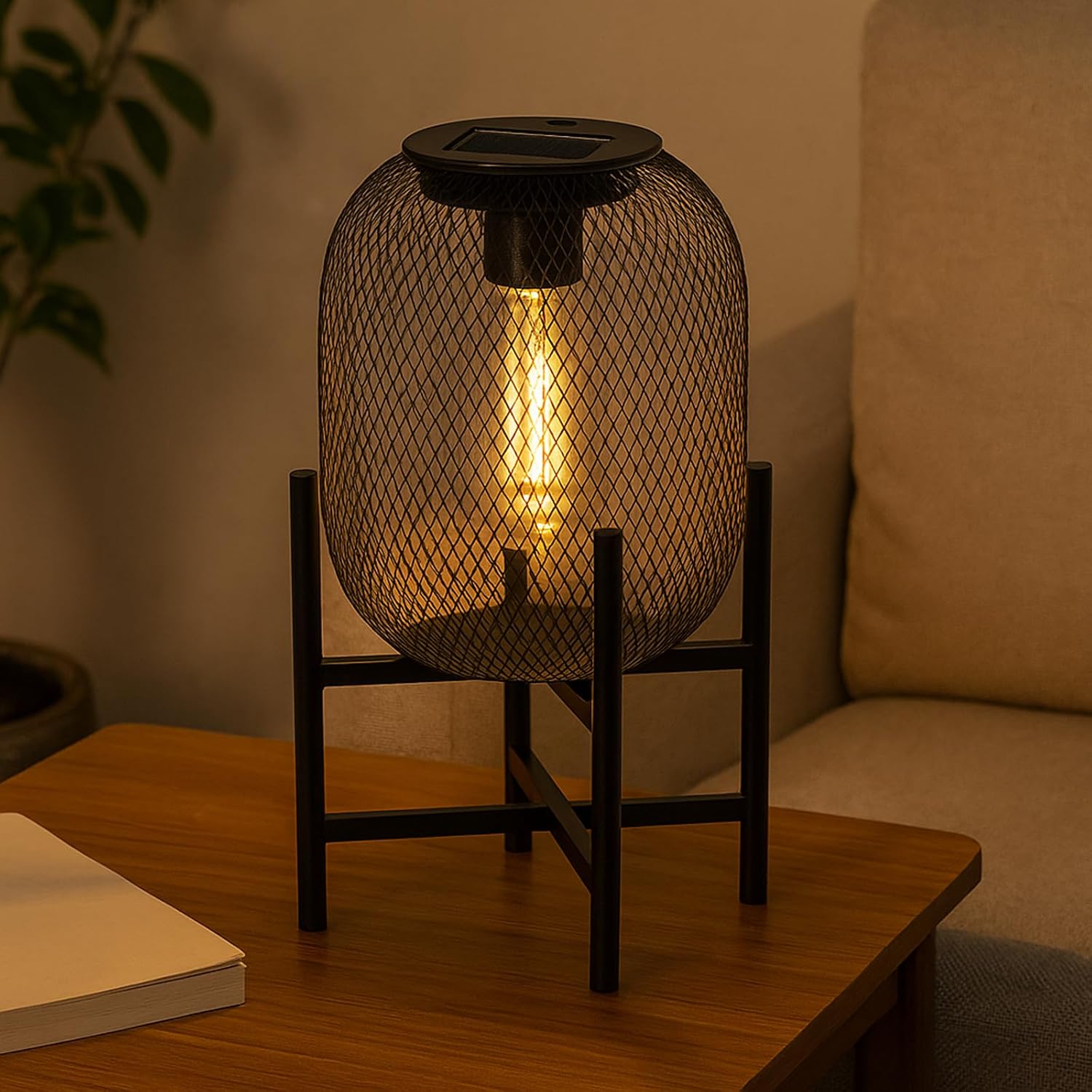 Solar Mesh Lantern Outdoor – 13.8" Tall Black Metal Patio Light with Edison Glass Bulb, Solar Powered Warm Glow LED, Waterproof IP65 for Garden, Porch, Deck, Tabletop Decor