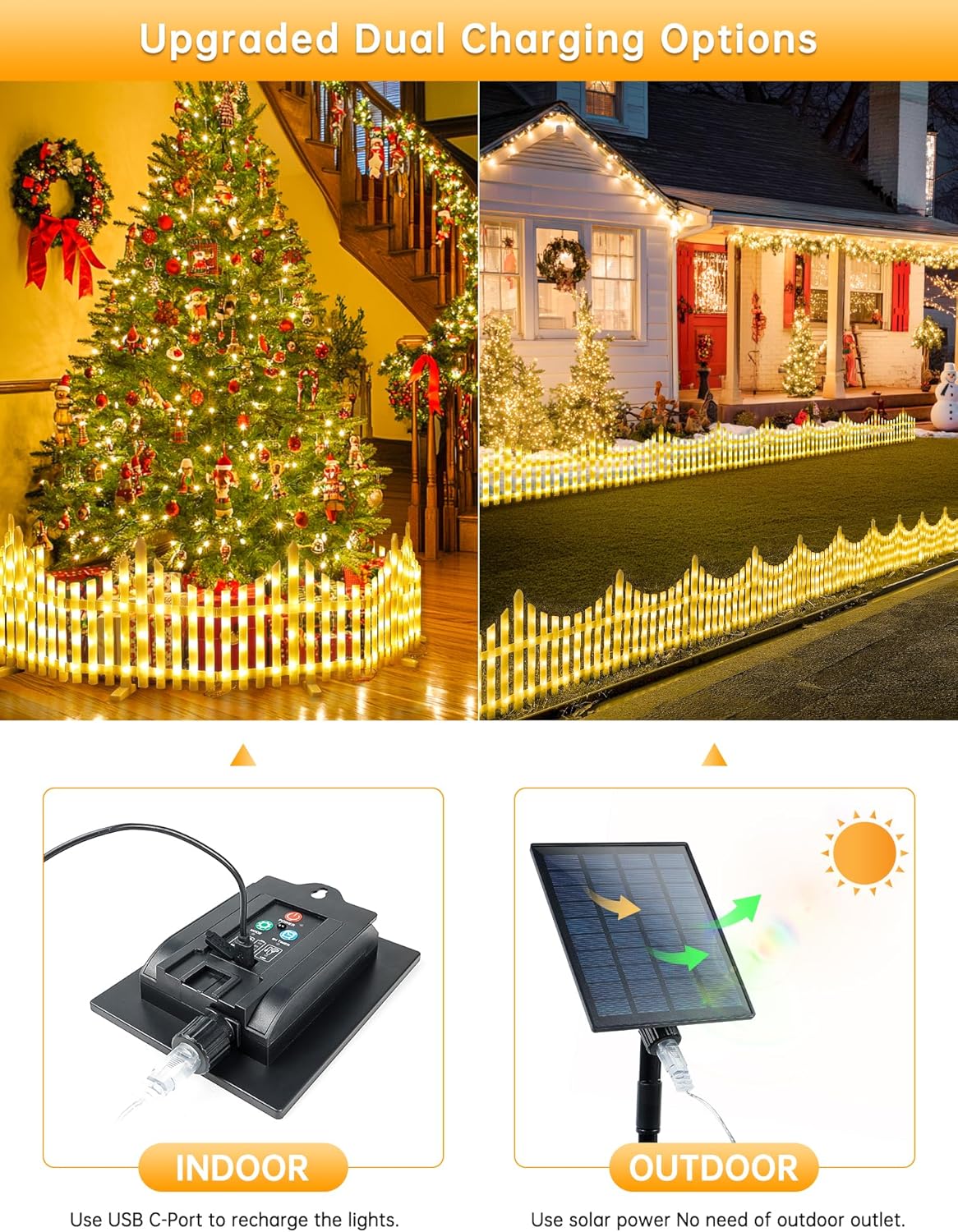 • 8 Lighting Modes:The Christmas tree fence solar lights can switch fantastic 8 lighting modes(combination,in wave,sequential,slo glo,chasing/flash,slow fade,twinkle/flash,and steady on) by the remote or the back of solar panel
