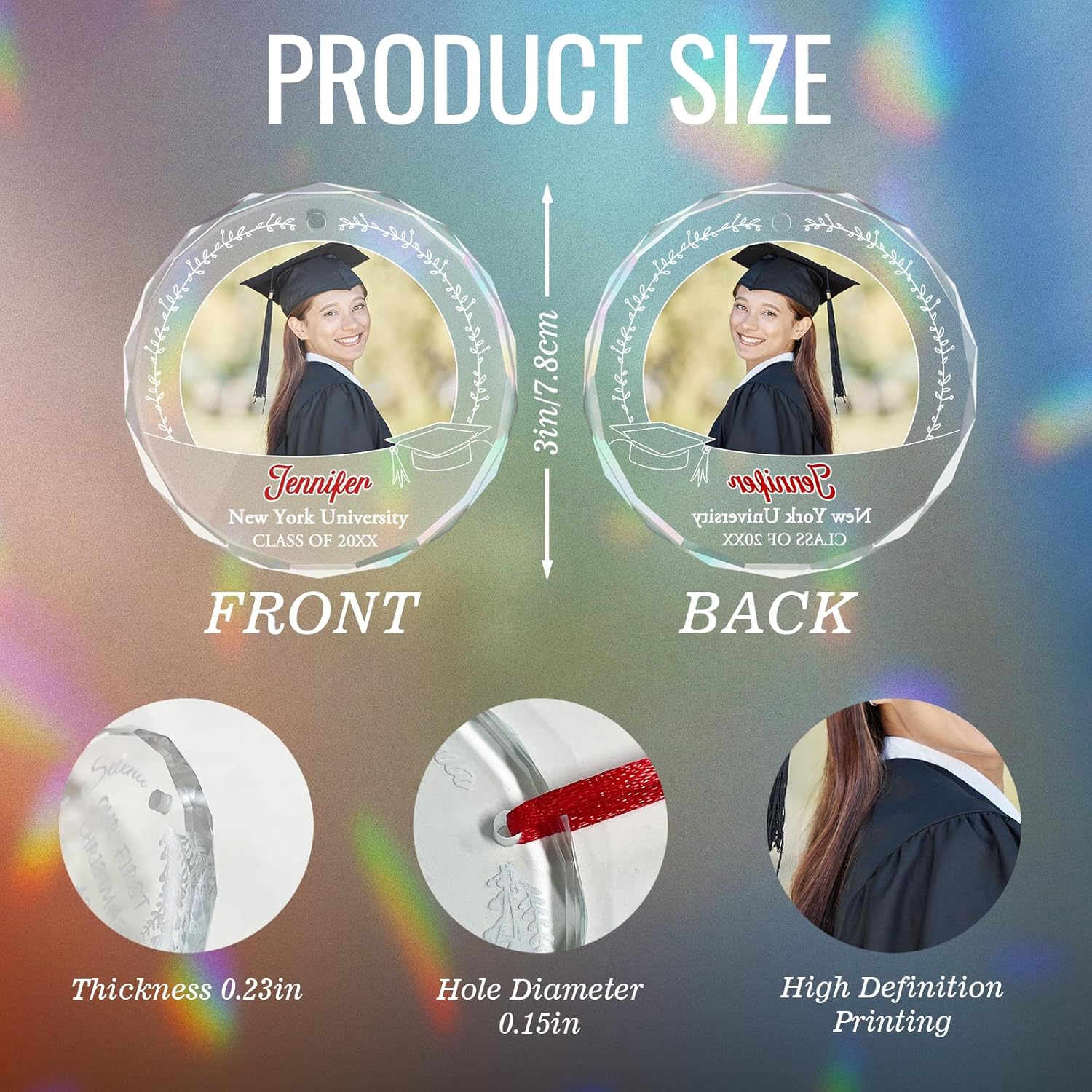 • Graduation Decor: Comes with a red ribbon, this beautiful personalized graduation glass ornament can be hung in any prominent place, desk, office, wall of honor, Christmas tree, doors, windows, walls and anywhere you want to decorate