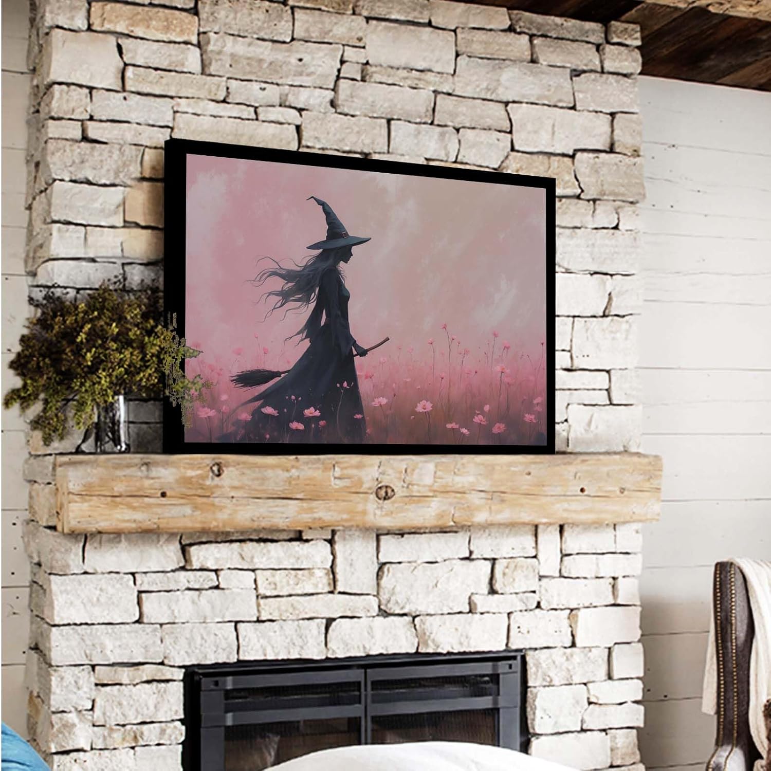 JFHCQJPK Witch in the pink sea of flowers Halloween prints weird flowers wall art silhouette painting fashionable romantic decoration suitable for bedroom24x36in Metal blackFramed