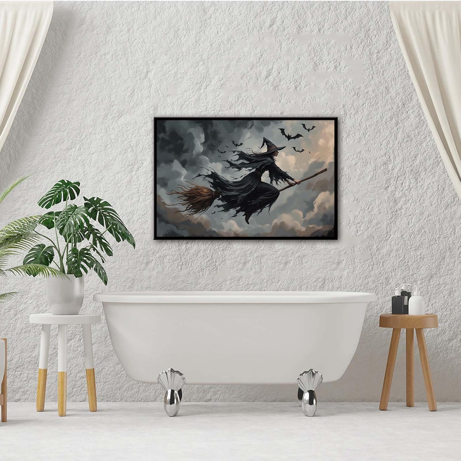 JFHCQJPK Witch and bat flying Halloween poster suitable for home party wall decoration retro Halloween preppy style wall art canvas print suitable for room decoration24x36in Metal blackFramed