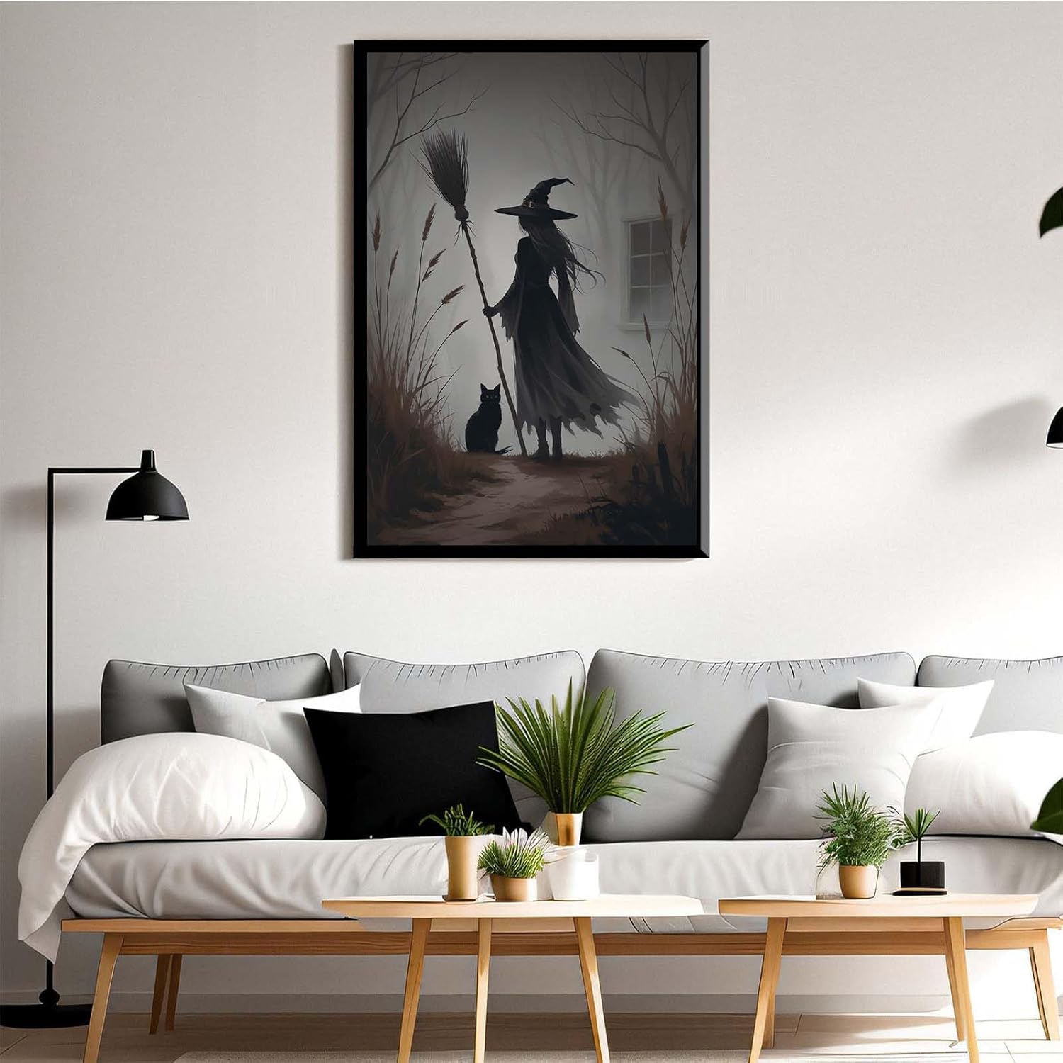 JFHCQJPK Vintage forest witch and black cat poster Halloween mural poster decoration mural art magic suitable for home living room bedroom20x30in Metal blackFramed