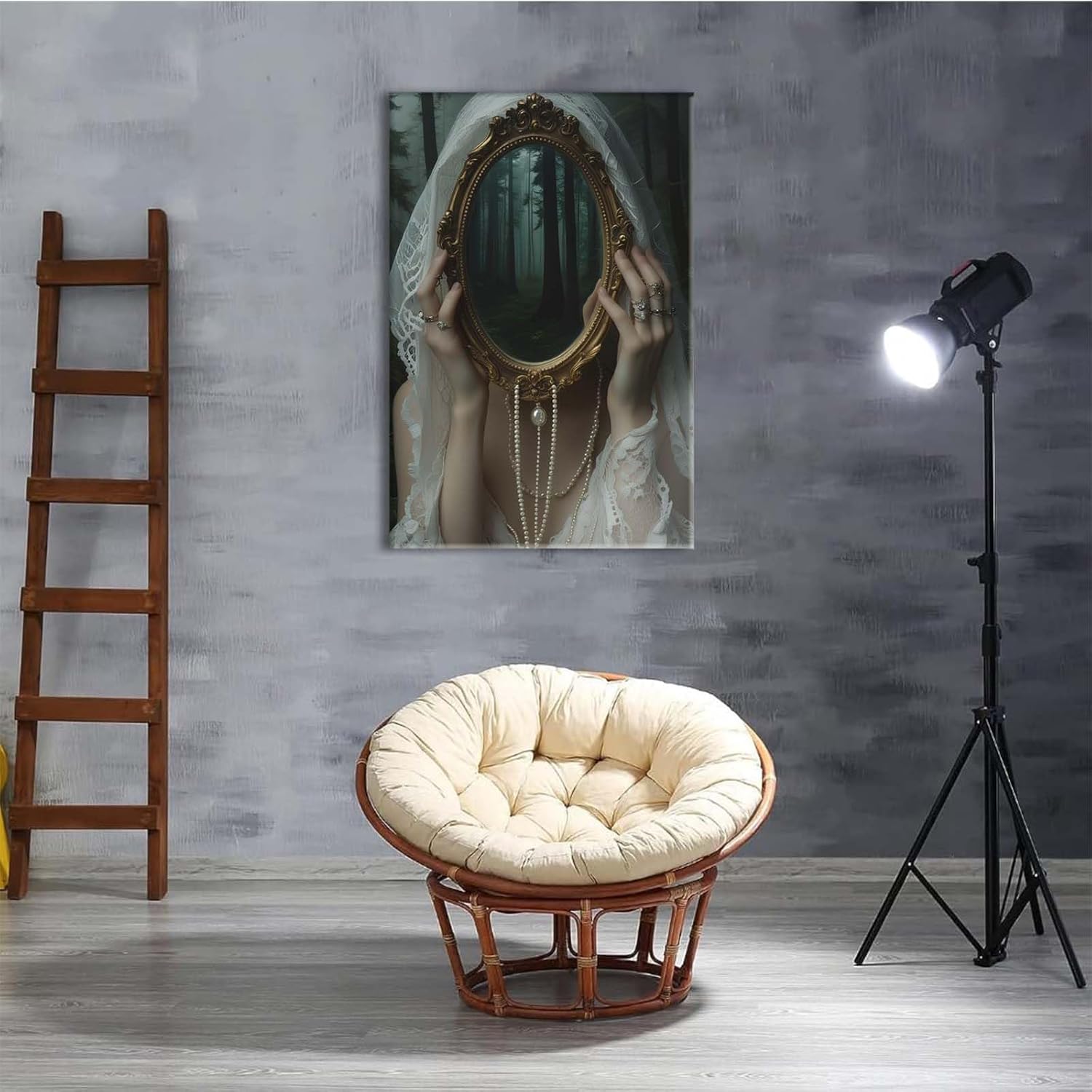 Mirror face covering dark art poster print melancholy gothic painting vintage feminine print victorian style decoration antique art24x36in Wood Framed