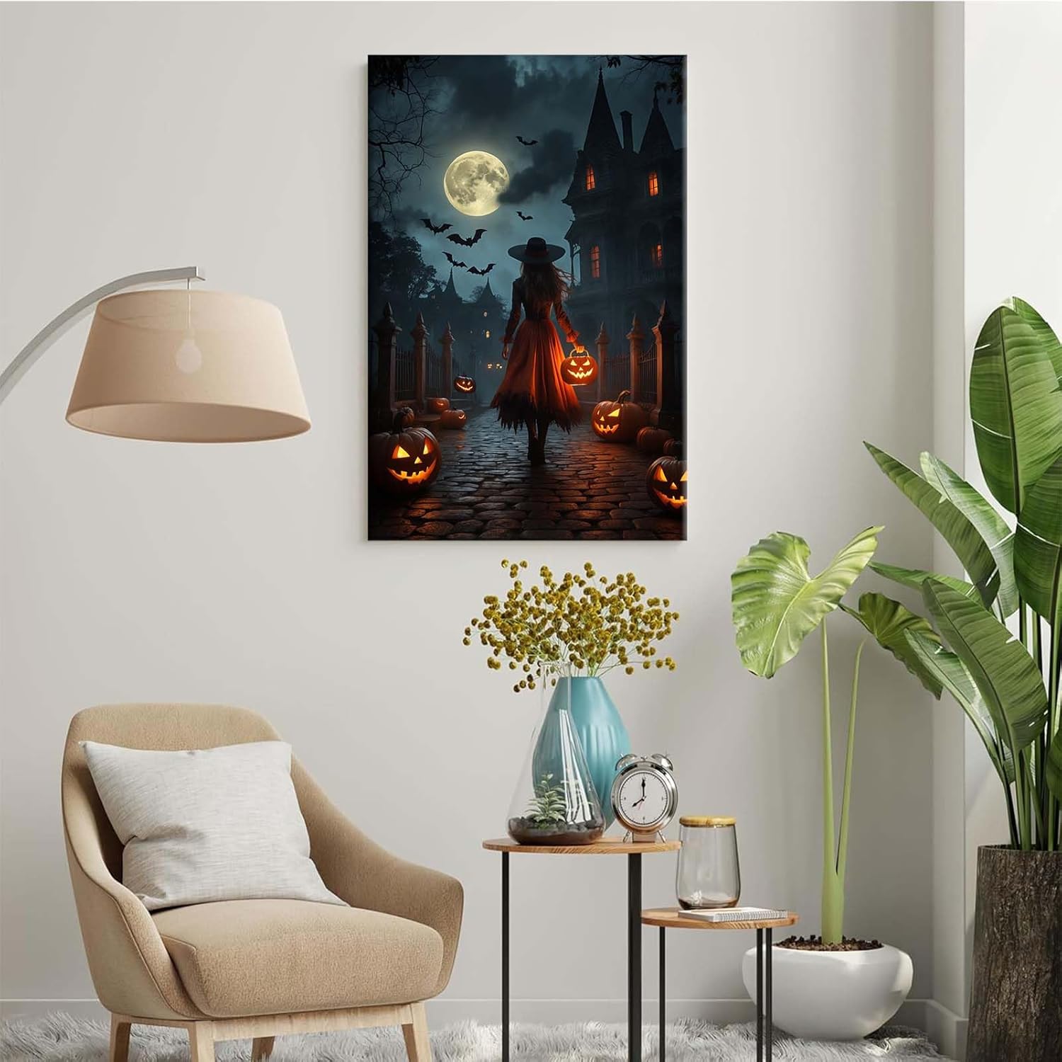 JFHCQJPK Halloween theme poster moonlit autumn night witch vintage poster art print dark college style gothic painting canvas wall decoration bedroom living room ideal gift12x16in Frameless