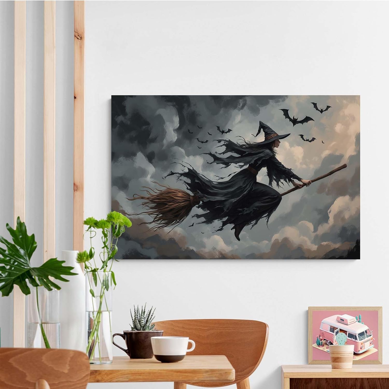 Witch and bat flying Halloween poster suitable for home party wall decoration retro Halloween preppy style wall art canvas print suitable for room decoration16x24in Wood Framed