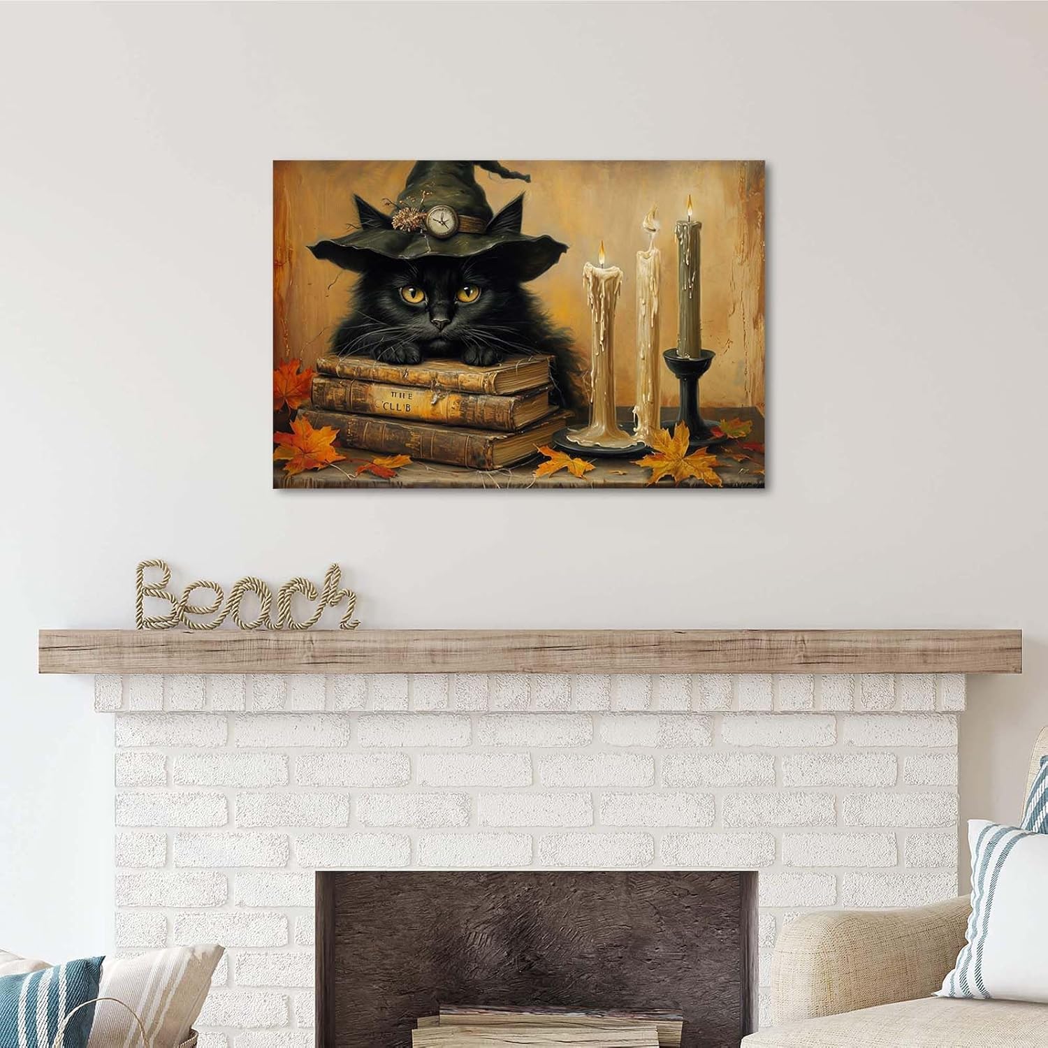 Vintage Halloween wall decoration black cat and magic book suitable for home bedroom living room decoration dark classic art witch wall decoration12x16in Wood Framed