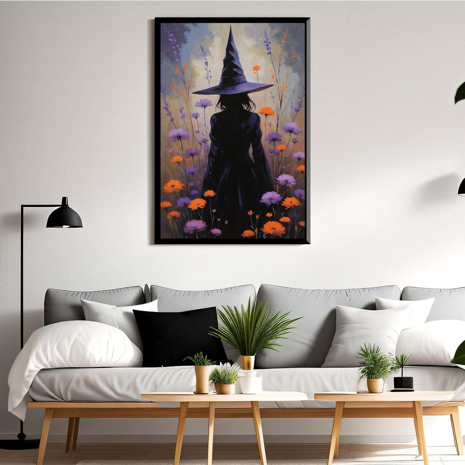 JFHCQJPK Country wildflower witch canvas print halloween mashup art witch purple decoration bohemian elegant art poster16x24in Metal blackFramed
